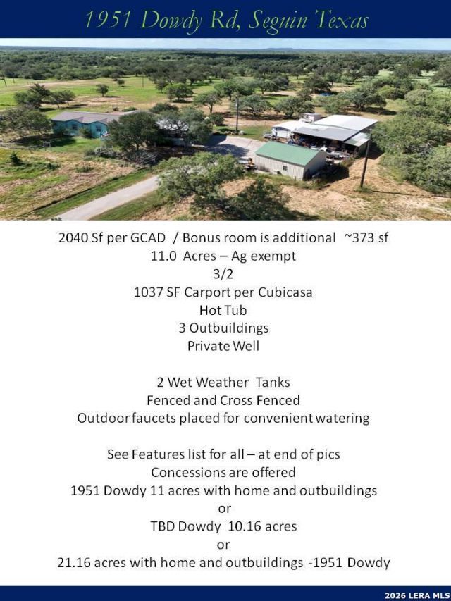 Wonderful views of the countrywide giving one a peaceful view that comes with LOW taxes. Discover your own ag exempt 11 acre Texas ranch. No water bill--your own water well that has been tested for water quality every year to ensure good drinking water for you and your and your livestock. So many extra features to list. Set behind a remote-controlled gated entrance, this ag-exempt Texas ranch offers privacy, usability, and well-considered improvements throughout. A paved concrete and asphalt drive provides clean, dependable access to the residence in all seasons. The home is designed for comfortable daily living with generous room sizes with a functional layout. The kitchen anchors the residence, featuring a substantial granite island, abundant cabinetry, and ample workspace, making it well suited for both everyday use and entertaining. In addition to the main living area, a versatile bonus room provides flexible space ideal for a private office, studio, or hobby room. The primary bath includes a jetted tub and separate shower. A spacious laundry room enhances convenience without compromising storage. Outdoor living is well established, with decks and a hot tub positioned to overlook the surrounding acreage. The private water well has been regularly tested and maintained. The property is well equipped for work, storage, and recreation. A powered auxiliary building includes both a walk-in entry and overhead door. The insulated workshop features two tall commercial-grade doors and sufficient clearance for equipment or RV storage, along with a covered concrete slab providing additional workspace. No need to add RV electrical supply as it is established. Agricultural infrastructure is already in place. A three-sided barn offers covered storage for hay, trailers, or equipment. Two tanks are located in close proximity, offering flexibility for future water management. Pens are positioned for direct access from the main drive, facilitating efficient livestock handling and trailer access. The acreage is cross-fenced with water available throughout. Aerial imagery captured during peak growing season highlights the propertys healthy pasture and water features. This property offers a rare combination of privacy, infrastructure, and functional acreage, suited for those seeking refined country living with the ability to actively use the land. Bring your horses or cattle for this property is already complete eagerly awaiting their arrival. The 11 acres will be cut from the original 21.16 acreage.