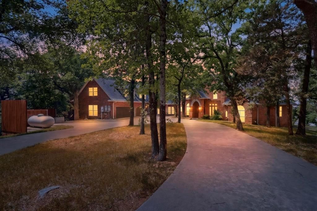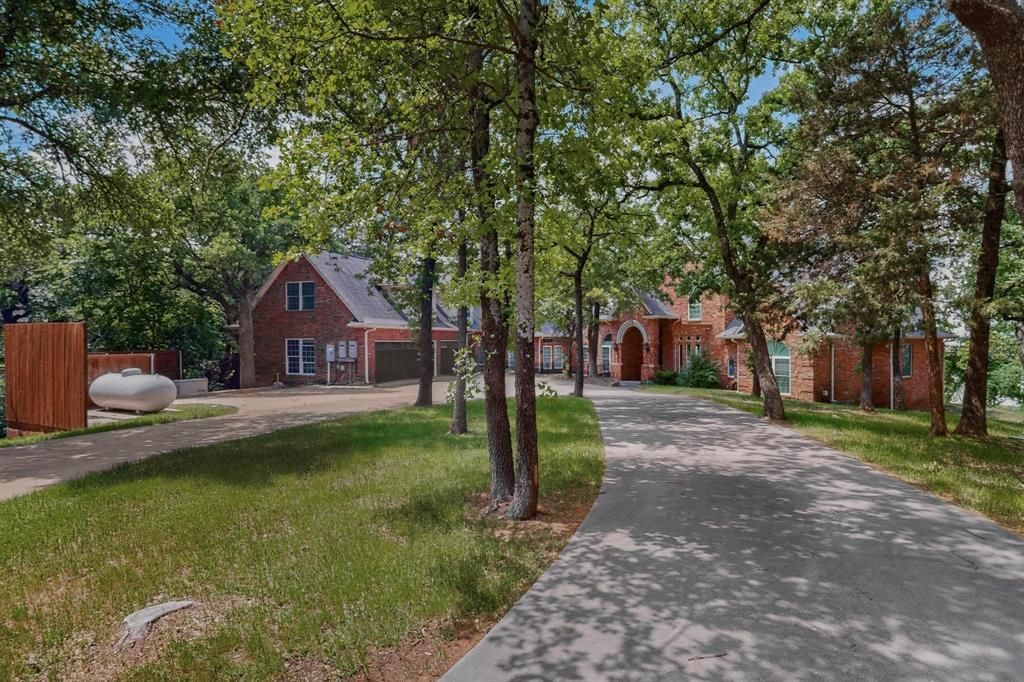 Welcome to this stunning Lake Lewisville Lakefront Estate, where sweeping water views add to this unique property. Main house is recently updated with new flooring and fixtures, plus bathroom & kitchen updates. Invite guests into grand living area, accented by dramatic staircase, stone fireplace, and incredible water views looking out to the horizon. Stately study is accented by sleek hardwoods, new carpet, and boasts impressive rounded windows, generous built-ins and secret door to storm shelter! Dining room glows under shimmering chandelier, making an elegant space for entertaining. Unique hardwood ceiling accents gourmet kitchen and provides ample countertop and built-in storage space. Luxury touches, including built-in industrial fridge, island, prep sink, and Viking hood make cooking a delight. Connected breakfast nook continues the thoughtful hardwood detailing and provides close patio access and generous views of expansive lake. Oversized primary is a retreat, with rounded bay windows looking out to the lake with ample space for peaceful sitting area. Spa-like primary bath includes dual vanities, separate garden tub and shower, and 2 WIC that provide plenty of custom built-in storage. Additional downstairs bedroom is perfect guest suite, with ensuite bath and WIC. Downstairs bright sunroom features built-ins, making it ideal for craft room or additional office space.Upstairs offers roomy game room with bay windows and convenient wet bar for entertaining. Additional bedrooms include jack & jill bath and WIC. 2nd floor of garage includes additional apartment space, with kitchen, full bath, living area, and bedroom. Outdoor oasis features generous multi-level patio space, perfect for outdoor seating or dining. Backyard leads down to the water with stone pathways and includes private woods for quiet seclusion. Additional features include oversized garage, 3 water heaters, 5 heat pumps, geothermal system for HVAC, and propane generator!