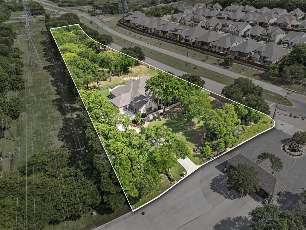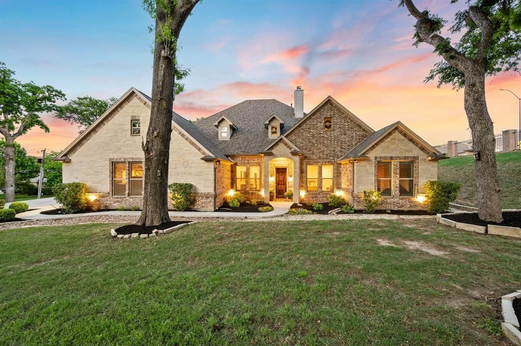 Tucked inside the prestigious guard-gated community of Riverbend Estates, this exceptional home sits on a rare 2.658-acre greenbelt lot with no near neighbors and a large open space maintained by the city, offering the feel of even more acreage without the maintenance. Surrounded by tall, mature trees and a peaceful setting, this property blends privacy, luxury, and thoughtful design while offering a rare opportunity to enjoy acreage within city limits. Inside, rich hardwood floors, soaring ceilings, and an open layout create an inviting atmosphere. The expansive living room features a stunning stone fireplace and flows seamlessly into the kitchen, where recent renovations have transformed the space into a true showpiece. Taj Mahal quartzite countertops, upgraded backsplash, recently replaced tile flooring, double ovens, gas cooktop, oversized island, and wraparound countertop with seating create a sophisticated eat-in kitchen ideal for gathering. A wine cooler, sonic ice maker, and handmade cabinetry further elevate the space. The spacious primary suite has been beautifully updated with Taj Mahal quartzite, a remodeled tub and shower, and upgraded tile flooring, creating a relaxing retreat. This home offers five bedrooms, each with ensuite bathrooms, along with multiple living areas including a massive upstairs game room with built-in speakers. A large mudroom, oversized laundry room with space for a refrigerator, extensive storage, and a rare four-car garage add everyday convenience. Step outside to enjoy the covered patio with an outdoor fireplace and grill, overlooking the large backyard complete with an in-ground heated pool and spa combo. Located minutes from dining, shopping, and major highways including 820, 121, 183, and I-30. The property may be eligible for Birdville ISD via application or transfer; however, this is a third-party process. Neither the sellers, Bray Real Estate Group, nor listing agents guarantee approval by the school district.