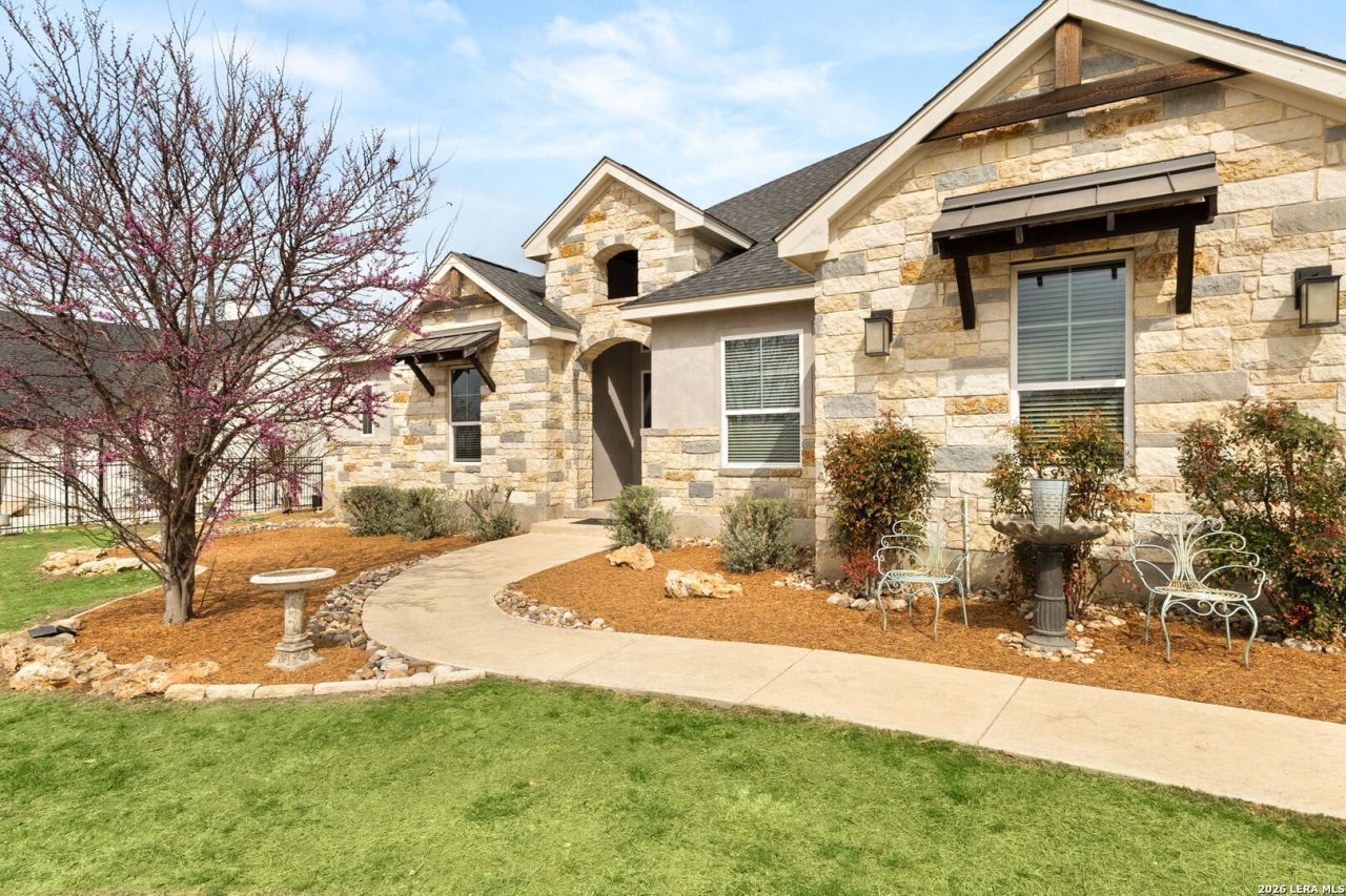 Welcome to Your Texas Hill Country Haven on 1 acre! If you are considering a move to a peaceful lifestyle, come discover the perfect blend of elegance and comfort this stunning home offers in the heart of the picturesque Hill Country! This versatile semi-custom residence features 5 spacious bedrooms and 3 baths, including a media/flex room and a dedicated office-ideal for remote work or family activities. The owners suite features soaring ceilings, a large custom walk-in closet, dual vanity sinks, and a spa-like oversized shower paired with a relaxing soaking tub. This one-owner home has an abundance of natural light, creating a warm and inviting atmosphere throughout. The gourmet kitchen includes a propane cook top and opens to the vaulted ceiling great room with the convenience of a large walk-in pantry . This gorgeous property is completely fenced with a private gate set on a 1-acre lot, the grounds are adorned with established trees including majestic Red Oaks, vibrant Redbuds, Monterey Oaks, and beautiful Crepe Myrtles, offering tranquility and space to relax. Enjoy Ample space for vehicles and toys in the oversized garage plus a full walk out attic with lots of storage for easy access. Located in the desirable Crossings at Spring Creek subdivision, enjoy access to a community pool, amazing walking trails along the creek, playground,volleyball court, and a pavilion with a built-in BBQ area-perfect for gatherings and outdoor fun!