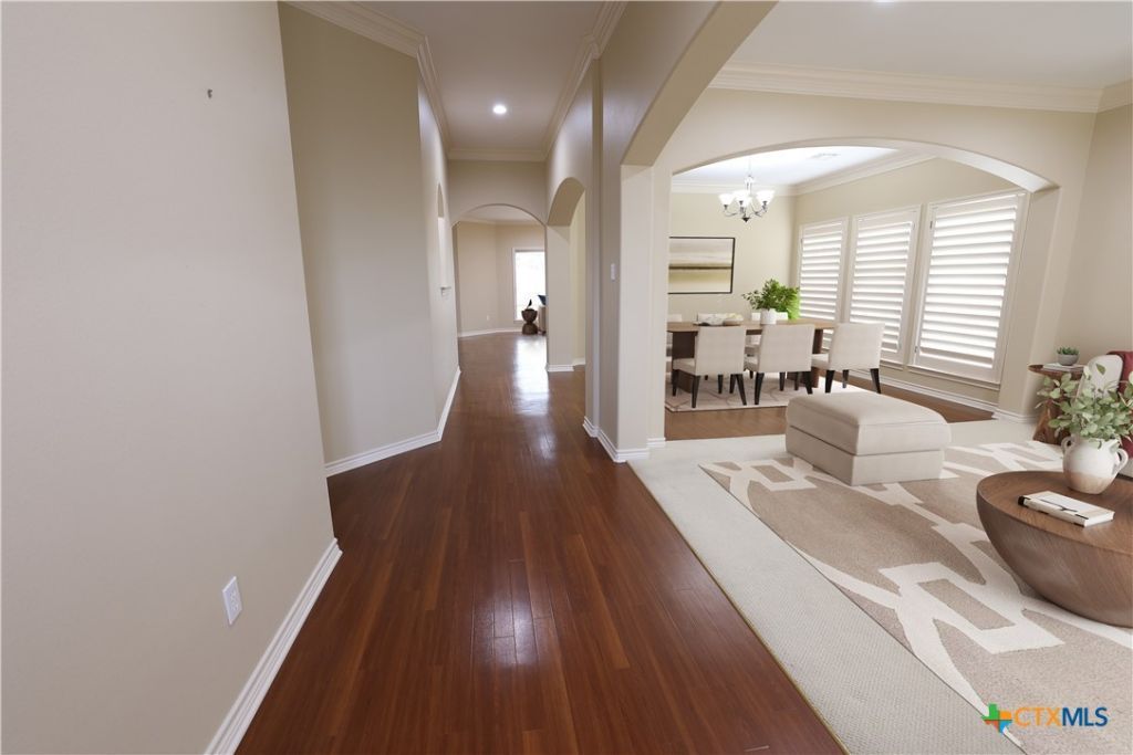 Custom Built and designed with thoughtful details and spacious living. This property offers: Primary suite featuring ensuite bath, double vanity, two separate closets plus two bedrooms and a hobby room. Plantation shutters in living room, dining room and primary bedroom add timeless elegance. Oversized garage with ample storage. Fenced backyard with screened in porch. Conveniently located near schools, parks, shopping, and restaurants.