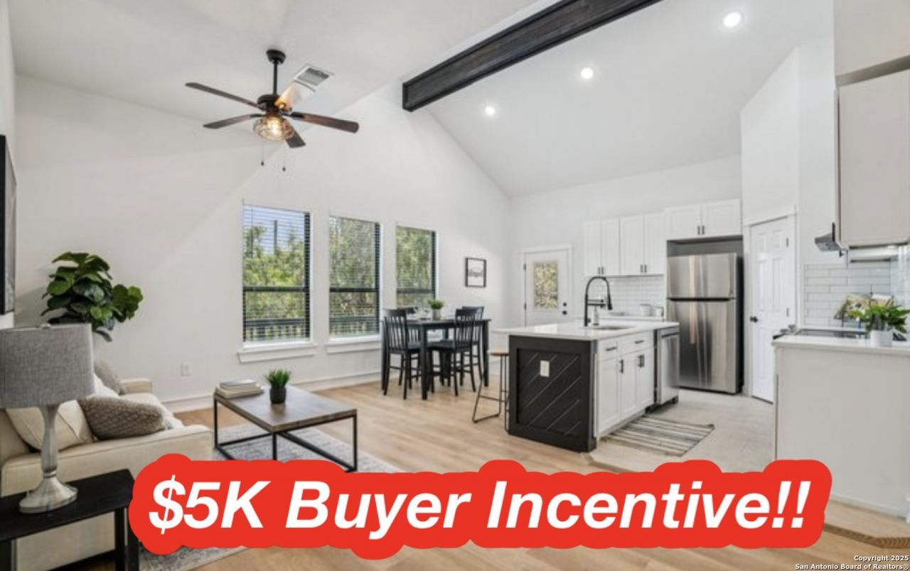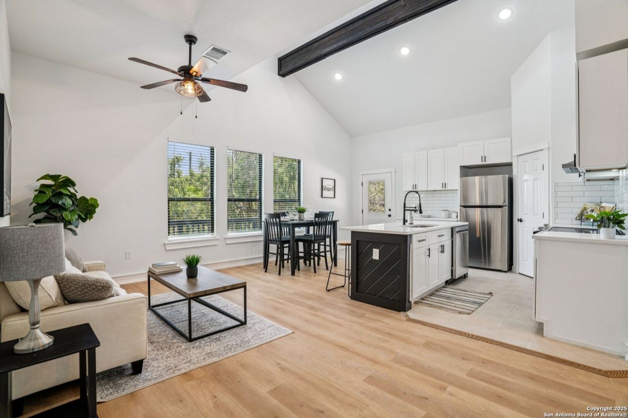 **Seller offering $5K Buyer Incentive to help with closing costs or to buy down interest rate** Beautiful fully renovated one-story, 3bed/2.5 bath home nestled in the heart of Lakehills, just minutes from scenic Medina Lake!! Filled with natural light, the open floor plan creates a warm and welcoming atmosphere from the moment you walk in. Step into a spacious living room featuring brand new luxury flooring, vaulted ceilings, and a striking wood beam that adds character and charm. From there, the space flows seamlessly into a gourmet kitchen with an oversized island, bar seating, quartz countertops, custom cabinetry, and brand new stainless steel appliances-including a refrigerator that conveys with the home. Enjoy a true retreat in the private primary suite, complete with a sleek walk-in shower, modern white vanity, and a generously sized walk-in closet. Two additional bedrooms offer plenty of space, with no carpet throughout for effortless maintenance. Step outside to an expansive front deck, perfect for sipping your morning coffee or relaxing with evening sunsets while soaking in panoramic Hill Country views and glimpses of Medina Lake when filled. Fully transformed with a new roof, siding, windows, updated electrical and plumbing, fresh paint, modern fixtures, a new driveway, and more, this home is truly move-in ready!! Dont miss your opportunity to own a beautifully updated property in this peaceful lakeside community. Schedule your showing today!