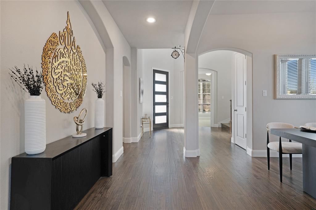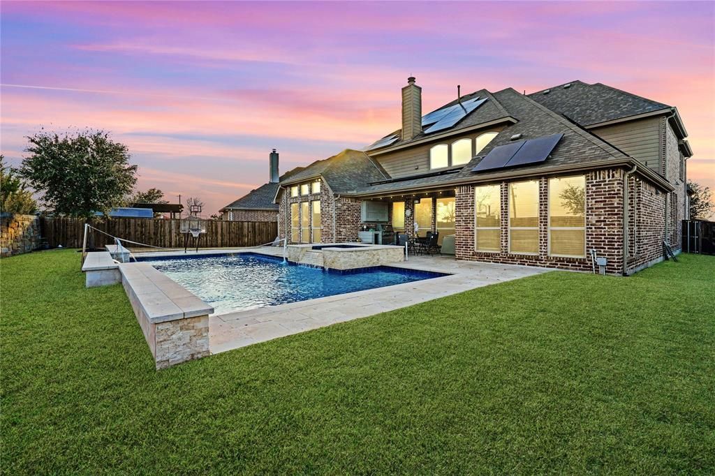 Exquisite two-story residence offering refined design, exceptional upgrades, and resort-style outdoor living in highly sought-after Prosper ISD. Soaring ceilings, abundant natural light, and hand-scraped hardwood floors create an impressive first impression. The open-concept layout centers around a dramatic two-story family room with a fireplace and expansive windows. A private study with French doors provides a quiet workspace, while the formal dining room is ideal for hosting. The chef’s kitchen features granite countertops, designer backsplash, double ovens, gas cooktop, stainless steel appliances, extensive cabinetry, and a dedicated coffee nook. The primary suite is a private retreat with a spa-inspired bath, dual vanities, soaking tub, glass-enclosed shower, and oversized walk-in closet. A main-level guest suite adds flexibility. Upstairs includes a spacious game room and dedicated media room for entertainment. The backyard is a true oasis with a sparkling pool and spa installed in 2021, featuring water features, EcoFinish plaster, travertine decking, LED lighting, full Hayward automation, auto-fill, and integrated basketball and volleyball systems. A covered patio and outdoor grilling station make entertaining effortless. A standout feature is the Tesla solar panel system with two Powerwall batteries, delivering exceptional efficiency and whole-home backup. The system has produced an average electric bill of just $135 per monthover the past year with estimated savings of $400–$500 monthly based on typical usage, offering a major long-term financial benefit. Additional highlights include a lightning protection system with surge arrester and a Tuff Shed for extra storage. Residents enjoy HOA amenities such as a clubhouse, community pool, greenbelt areas, park, playground, and jogging and bike paths. Ideally located within 10 minutes of premier shopping, dining, and major highway access