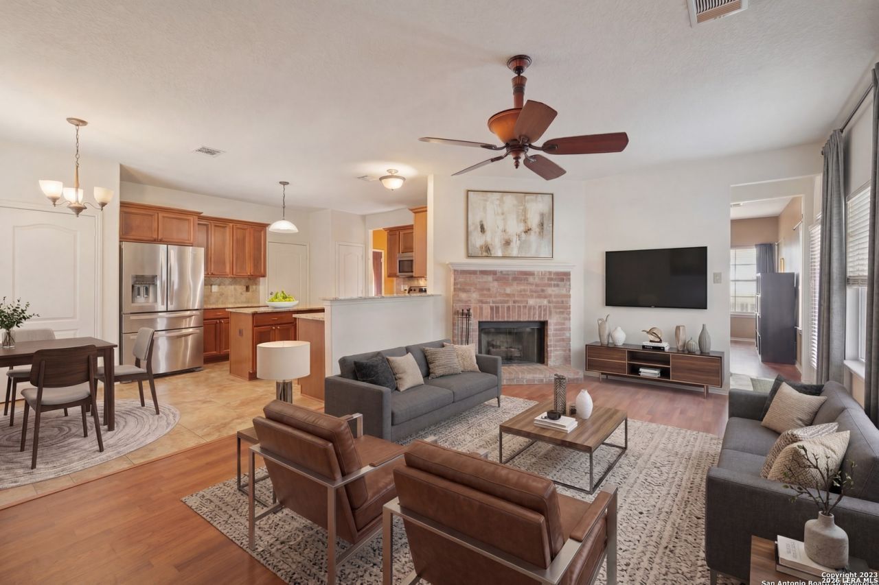 Brand new roof added ! Visit this stunning 4-bedroom, 2.5-bathroom residence in Universal City, boasting convenient access to highways, The Forum shopping, and the SAT airport expansion. This charming home blends musician flair with Austin-inspired vibes, perfect for entertaining. Featuring two living areas, a wood-burning fireplace, and tasteful tile and flooring, the propertys unique floor plan is ideal for social gatherings. The four upstairs bedrooms offer ample space, including a cozy nook in the master closet and primary bath, complemented by two closets.This home is sits on a corner lot and seperated 2 car garage ,a definite must see!