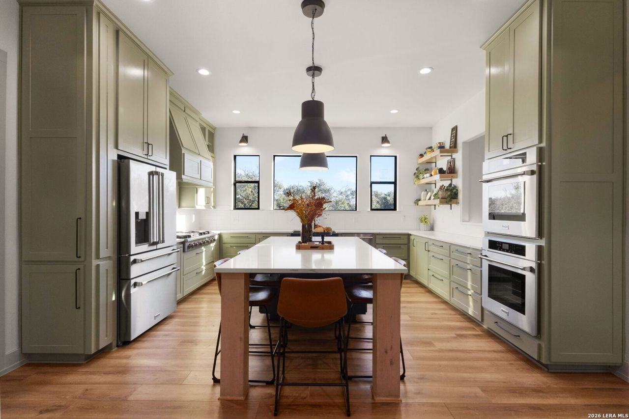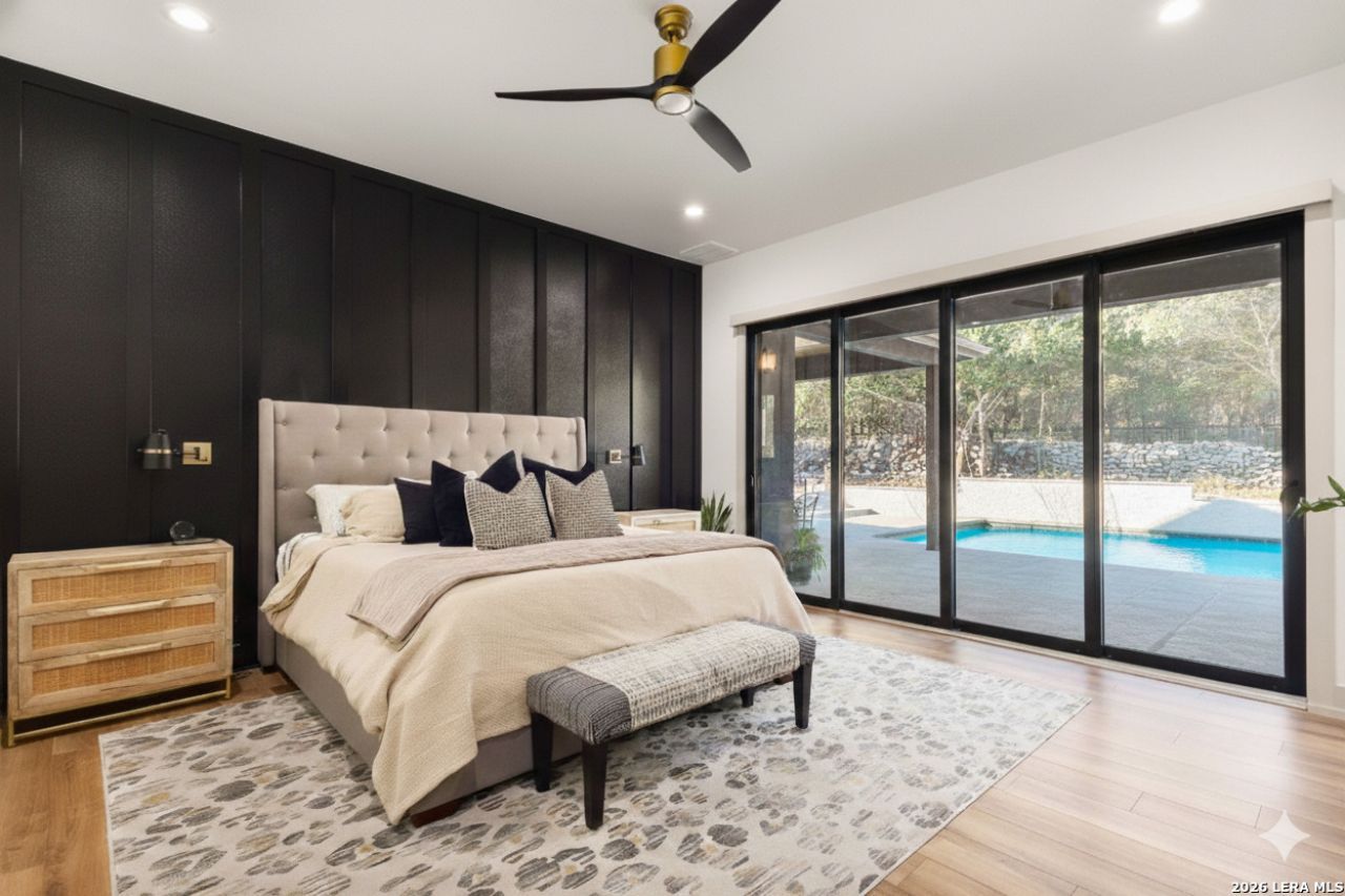 Sellers will consider offering OWNER FINANCING! Custom-built 2023 showpiece home in Vintage Oaks just outside of New Braunfels city limits. Every detail has been thoughtfully curated, from the grand iron front door and tiled feature fireplace to the soaring ceilings and walls of windows that fill the home with natural light. The heart of the home is the exquisite gourmet kitchen with a walk-in pantry, custom cabinetry, a double convection oven, THOR appliances, a built-in lower microwave, and a statement vent hood. Quartz counters and an oversized island anchor the space, complimented with open shelving and a sleek design thats both functional and beautiful. Entertain in the spacious living area with a wood-burning fireplace and built-ins or open the custom sliding glass doors to the backyard oasis. Outside, the sparking custom autofill pool includes a cascading water fall, tanning ledge with bubblers, and a relaxing fountain-all framed by hill country landscaping for ultimate privacy. The 4-bedroom, 3.5 bath layout offers flexibility and privacy, including a separate flex room or bedroom with a barn door. The primary suite is a serene retreat with a luxury primary bath featuring a freestanding tub beneath a chandelier, custom shower, dual vanities, and an expansive walk-in closet complete with built-in drawers an additional lockable closet for valuables. Windows have custom automatic blinds for privacy and provide a great cozy environment for movie nights. Home is hard wired with internet and security. Security cameras can be controlled from your phone, along with pool features. Additional highlights include a large utility room with a hammered metal sink, a mudroom area, abundant storage throughout and a large attic space about the three-car garage that can be finished into additional living space (about 1200sqft). Lot sits across the street from the trails, listen to the music series from your porch and see the fireworks. 2 min drive to amenities. Comal ISD.