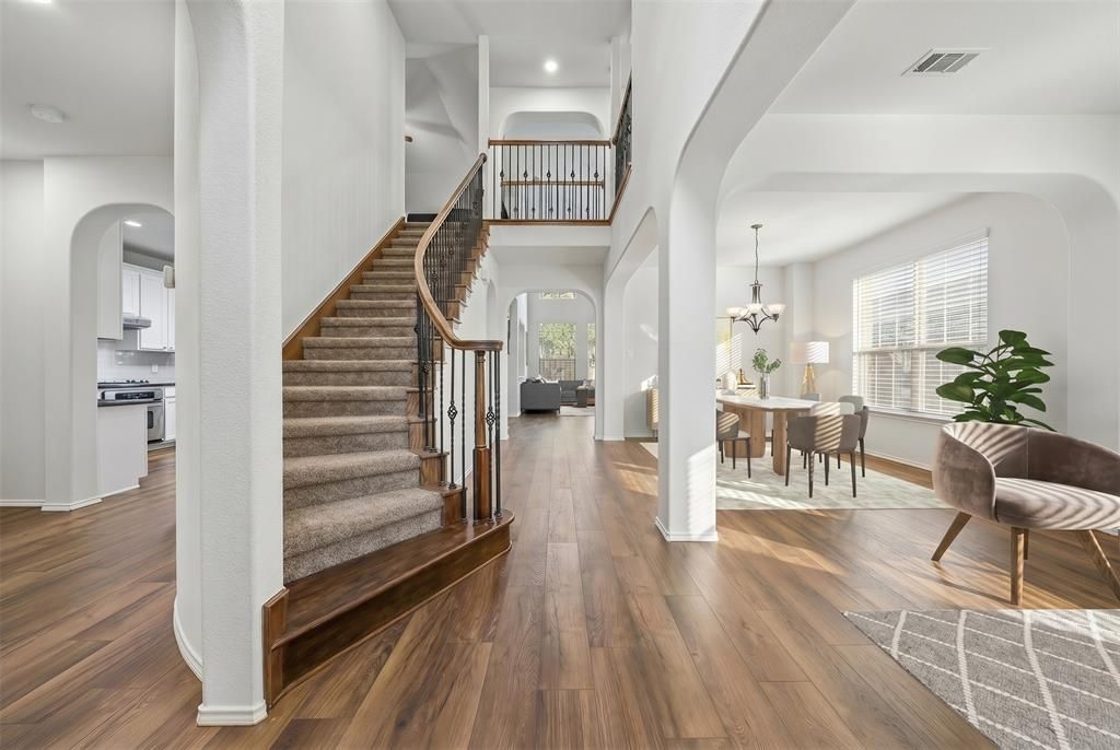Welcome to this beautifully updated home that perfectly blends timeless architecture with modern comfort. Nestled on a tree-lined street, the striking brick façade, arched windows, & mature landscaping create an inviting first impression w-undeniable curb appeal. Step inside to soaring ceilings & a grand entryway anchored by a dramatic curved staircase w-wrought-iron balusters. Rich flooring flows seamlessly throughout the main living areas, complemented by elegant arched openings & an abundance of natural light that fills the home. The thoughtfully designed layout offers both functionality & style, featuring stacked formals. The spacious main living rm showcases a stunning two-story ceiling, expansive windows, & a cozy fireplace, creating the perfect setting for everyday living and gatherings. The kitchen is open & well-appointed w-generous counter space, ample cabinetry, & a breakfast bar that connects effortlessly to the living area—perfect for hosting or casual dining. An elegant Primary Bed features soaring vaulted ceilings & a serene sitting area.The spa-inspired bath offers dual vanities, a soaking tub, a separate glass-enclosed shower, & a boutique-style walk-in closet w-built-ins. Private executive study with large picture window, offering a refined and quiet workspace ideal for working from home or a sophisticated flex space. An elevated upstairs living space designed for both entertaining and relaxation, featuring a spacious game room with open railing detail overlooking the main level. Seamlessly connected, the dedicated media room offers a true cinematic experience w-projection screen & tiered seating—creating the ultimate setting for movie nights, game days, or hosting guests in style. Park-like backyard featuring a covered patio perfect for outdoor living & entertaining. Lush landscaping, mature trees, & a tranquil water feature create a serene setting, complemented by an extended patio & spacious grassy area for relaxation or play. Virtually Staged
