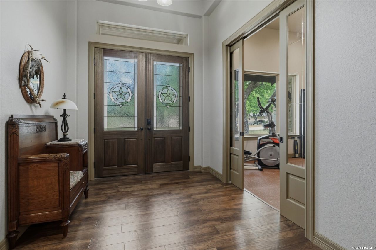 Custom Canyon Lake home with both Hill Country and Canyon Lake views. A beautifully crafted home offering thoughtful design and high-end features throughout. This home blends luxury with functionality, incorporating Jack and Jill bedrooms/bathroom and the Master suite both on the main floor but on opposite sides of the house. The natural flow from the 3-car garage thru the laundry/mud room, past the powder room, and a front facing multi-functional room with custom flooring all work well to surround the daily living space. (Some additional information includes both the Master and Jack & Jill bathrooms features Cambria quartz countertops with impeccable pattern matching and the back facing bedroom includes a sunroom offering flexible living space.) On this main floor youll find a Gourmet kitchen showcasing hickory cabinetry (stained with weathered teak), a multi-level island with top-of-the-line granite and a smaller work island thats been leathered for contrast. A Hickory barn door leads to a large walk-in pantry that expands at the rear for additional space. Top this off with over/under cabinet lighting, soft close cabinetry (several pull-outs) and a glass top gas stove - whoever spends time in the kitchen will want for nothing! The living room is anchored by a gas fireplace with a "floating" 6-inch live-edge pecan mantel creating a warm and inviting focal point. The fireplace stone and the stone face of the kitchen island match the exterior of the home. Hand-scraped hickory floors run throughout the home, complimented by 5-in base boards and 8-foot interior doors. Hunter-Douglas top-down/bottom-up shades and ceiling fans are also found throughout the home. Take the single landing stairs up to find a large game/media room with surround sound, a large guest friendly full bath and an impressive custom live-edge pecan bar with hop/grain inlays and plenty of room for milling around. The custom cabinetry and lighting continue and is complimented with the double tap kegerator, under counter refrigerator, storage cabinets, mirrored accents and floor to ceiling windows. The sliding glass door leads out to an oversized balcony with cedar toppers and remote all weather shades which can enclose the entire balcony. Off the balcony is an entrance to the smaller attic area (the larger is off the upstairs bathroom). Outdoor living is exceptional. Including a covered partially enclosed 15x8ft swim spa, two separate deck areas for entertaining or just taking in the views and wider stairs leading to a flag stone patio with a built in firepit. Partially dried in storage is also available under the deck. On the other side of the home you will find a sitting area with a dual propane heat system for evening viewing of the Hill Country or morning bird watching. This area has an established in-ground arial feeding station. Some additional highlights include but are not limited to: Central Vac, SONOs sound system (inside and out), Reme