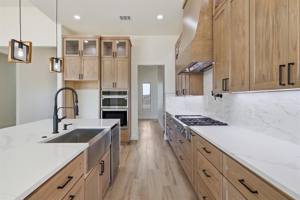 Completed new construction! Move in ready! Experience peaceful country charm on a 1-acre homesite with this beautifully crafted residence with no HOA. Designed to blend luxury with everyday livability, this 2,937 sq. ft. home with a 3-car side entry garage offers a serene setting with scenic views and a thoughtfully curated interior that feels both elegant and modern. A welcoming front porch with space for rocking chairs and stunning iron double front doors with glass set the tone for the style and craftsmanship found throughout the home. Inside, the grand living room impresses with soaring 13-foot tiered ceilings accented by LED lighting and a striking fluted wood fireplace that serves as the focal point. High-end slider doors flood the space with natural light and seamlessly connect the indoors to the covered patio, perfect for indoor-outdoor living. The entry and kitchen feature 11-foot ceilings, enhancing the home’s airy, open feel. The kitchen is a true showpiece, showcasing quartz countertops, a dramatic waterfall quartz island, ceiling-height cabinetry with glass upper cabinets, and a gas cooktop with a convenient pot filler. A stunning butler’s pantry with glass cabinetry provides additional storage and prep space while adding a refined, custom touch. Two built-in desks in the home offer ideal spaces for working from home, managing daily tasks, or creating a dedicated homework station. The split floorplan prioritizes privacy, with a serene primary suite set apart from the secondary bedrooms. The luxurious primary bath offers a spa-like retreat with designer finishes, dual vanities, an eye catching black freestanding soaking tub, a spacious walk-in shower, and an expansive custom closet with built-in shelving. A desirable 3-car side-entry garage with a rear-oriented driveway adds both convenience and curb appeal. Built for lasting quality, the home features a piered slab foundation supported by 30 engineered piers.