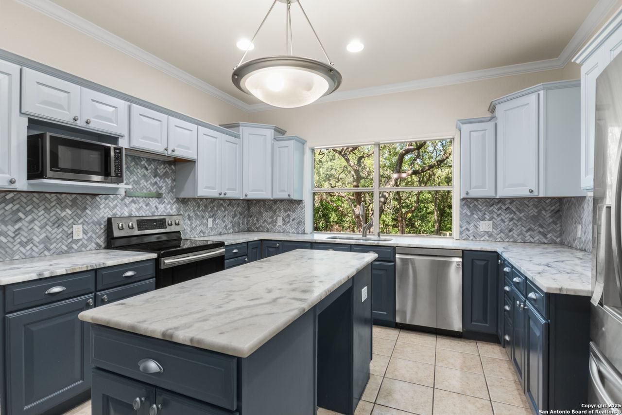 Beautiful 3 Bedroom, 2.5 Bath Home with Oversized 3-Car Garage on a Full Acre in Sought-After Helotes. Set on a lush 1-acre lot, this spacious home offers soaring ceilings, an open-concept floor plan, and abundant natural light throughout. A wall of windows across the back of the home provides breathtaking views of the expansive backyard and mature trees. The updated chefs kitchen is equipped with stainless steel appliances, an oversized island, breakfast bar, and ample cabinetry for storage. Thoughtfully designed, the home features two laundry rooms, one on each level for added convenience. Upstairs, the generous primary suite includes dual walk-in closets and a private en-suite bath with a large walk-in shower. The second floor also offers a flexible loft space, plus two additional bedrooms and a full bath. Step outside to a backyard retreat that backs to a greenbelt on a seasonal creek with a cliff behind. There are spacious patio areas and a built-in firepit, perfect for outdoor entertaining or quiet evenings under the stars. The attached 3-car garage includes both a traditional 2-car bay and a extra wide and extra long 1-car bay, offering extensive space for vehicles, tools, or projects. Freshly painted and move-in ready, this home is ideally located just minutes from scenic nature trails, shopping, and dining. A rare find in Helotes, welcome home.