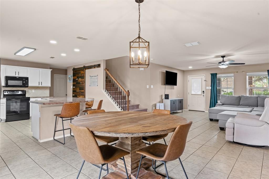 Impeccably maintained 4-bedroom, 2.5-bath home in the Alliance area offers the perfect blend of style and functionality. The open-concept main floor features durable tile flooring throughout the common areas, flowing seamlessly from the spacious living room to the inviting kitchen, ideal for entertaining or everyday life. A custom reclaimed-wood barn door adds character to the cleverly finished under-stair storage nook. All bedrooms are located upstairs, including a generously sized primary suite with walk-in closet and an en suite bathroom featuring a separate tub and shower. Outside, enjoy evenings under the expansive cedar-covered patio, complete with a statement hangar-style ceiling fan. The 2021 roof includes solar panels—buyers may assume the payments or sellers will have them removed at closing. Located in the Quail Grove neighborhood with low HOA fees, within walking distance to the playground and minutes from major roads, shopping, and dining.