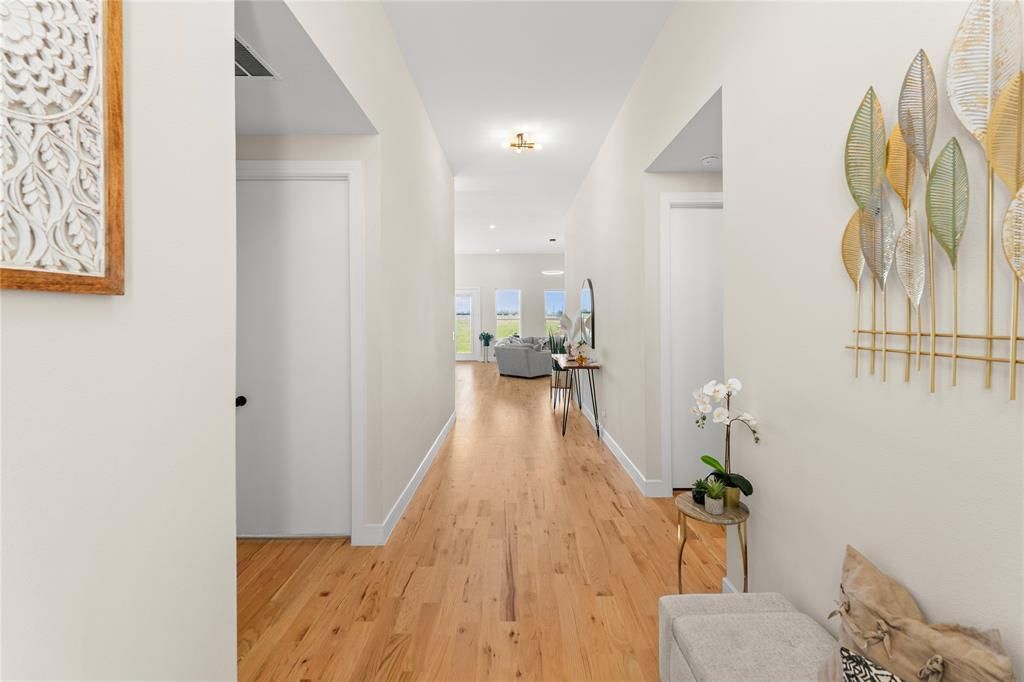 Welcome to this stunning modern home offering 4 spacious bedrooms, 2 beautifully designed bathrooms, and 2.32 scenic acres — complete with your own private pond for serene views and unforgettable sunsets. From the moment you arrive, you are greeted by the impressive curb appeal, 2-car garage, and expansive concrete driveway with plenty of space for guests. Step inside to soaring ceilings and an abundance of natural light that highlight the home’s open, airy layout. The heart of the home is a show-stopping kitchen featuring a massive 10-foot island, sleek quartz countertops, stainless steel appliances, abundant cabinetry, and a spacious pantry — perfect for entertaining or everyday living. The oversized living room provides ample space to gather and create lasting memories, while the dining area is ideal for hosting holidays and special occasions. Retreat to a luxurious primary suite designed for comfort and elegance, complete with double vanities, quartz countertops, designer lighting, a glass-enclosed shower with a built-in bench, and a generous walk-in closet. Enjoy the covered patio where you can relax and appreciate the peaceful surroundings.This property offers the perfect blend of modern style, space, and privacy, all while keeping you close to city amenities.