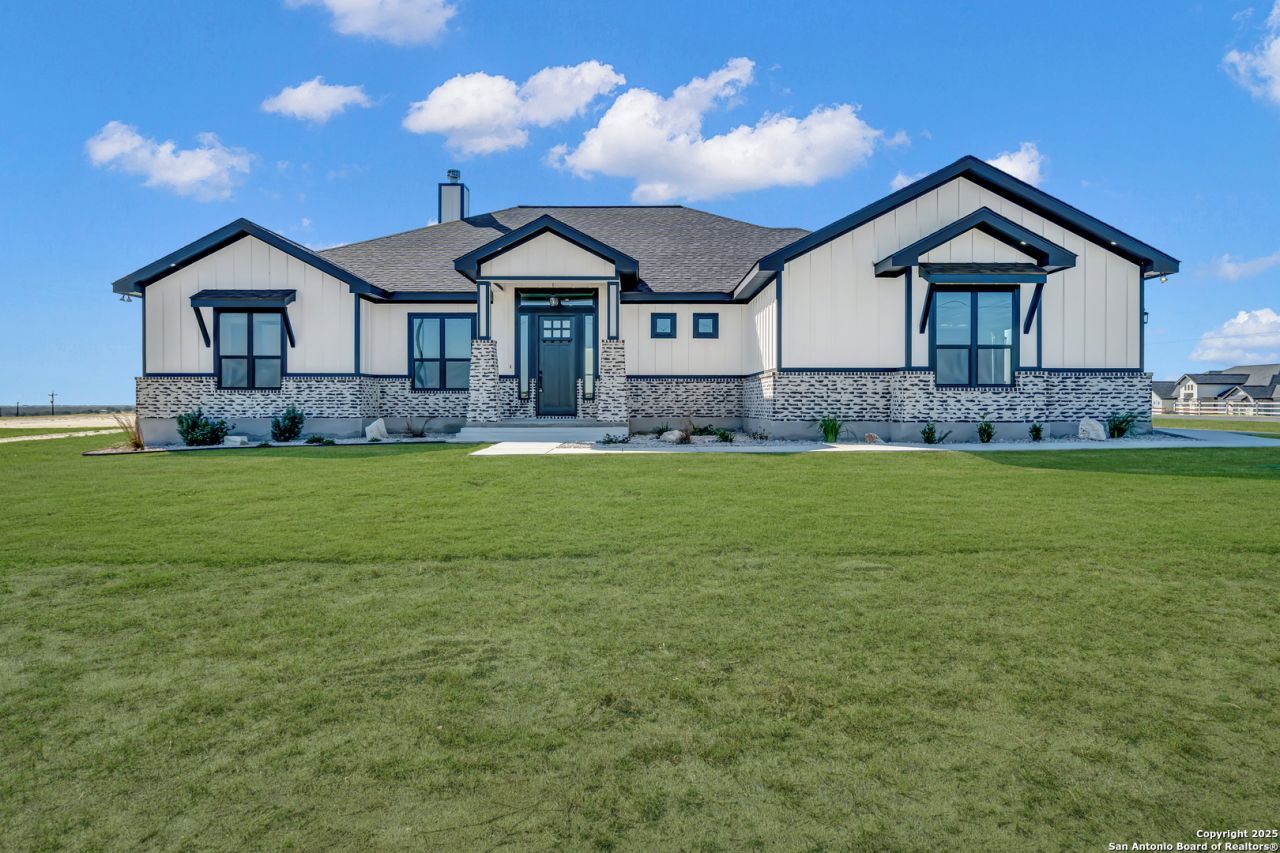 Welcome to this thoughtfully designed home nestled on a serene 1-acre lot in La Vernia. This 4-bedroom, 3.5-bath residence offers an open-concept layout filled with natural light and modern finishes throughout. The floor plan includes a private office, a guest suite with its own full bath, and a Jack-and-Jill bathroom connecting two secondary bedrooms-perfect for family living or hosting overnight guests. The primary suite is a standout feature, offering an oversized walk-in shower, spacious bedroom, and an impressive walk-in closet with direct access to the laundry room for added convenience. At the center of the home, the gourmet kitchen shines with a large island, custom cabinetry, pot filler, and a built-in wine and beverage fridge. The living room provides a cozy focal point with its wood-burning fireplace, creating a warm and welcoming gathering space. Step outside to enjoy the expansive back porch overlooking peaceful country views-an ideal spot for morning coffee or evening relaxation. With its thoughtful layout and high-quality finishes, this home delivers comfort, style, and the quiet charm of Texas country living. Come experience it for yourself!