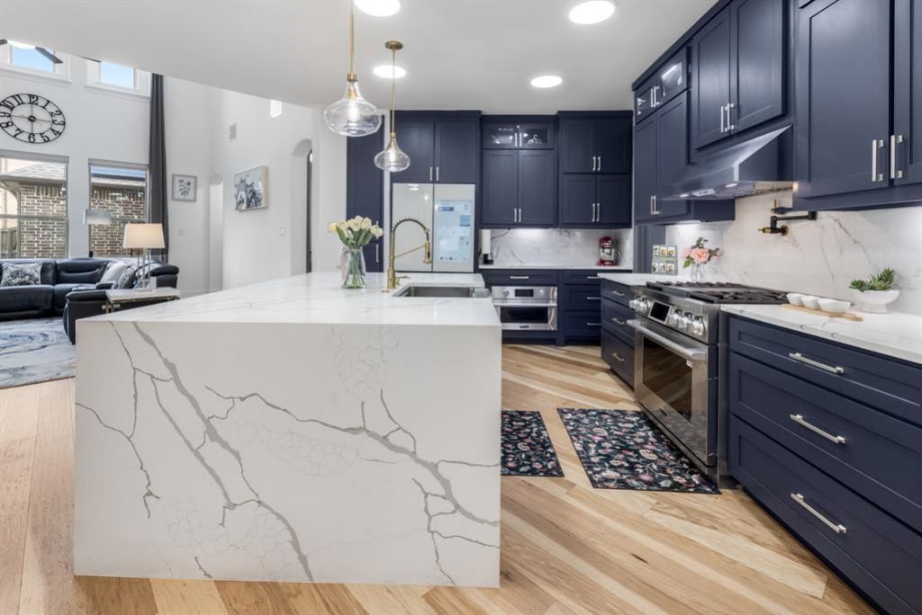Welcome to a renovated home where timeless architecture meets modern luxury and thoughtful design.From the moment you arrive, the striking brick and stone façade, arched entry, and lush landscaping set an impressive tone. Inside, soaring ceilings, rich hardwood floors, and a sweeping curved staircase create a grand yet inviting first impression.Designed for both everyday living and effortless entertaining, the light-filled open-concept living area showcases a dramatic floor-to-ceiling fireplace and seamless flow into a stunning chef’s kitchen. Here, you’ll find a statement quartz waterfall island, custom cabinetry, Signature collection stainless steel appliances with commercial grade range and vent hood, convection microwave -with built in air fryer- and oven, designer lighting, and a spacious walk-in pantry—equal parts beauty and function. The dining area has a dry bar with under cabinet lighting and extra storage, perfect for a coffee bar. A dedicated home office with custom built-ins offers a polished and productive workspace, while the upper level features a versatile game room and a true media room, perfect for movie nights and gatherings.The expansive primary suite is a private retreat, featuring vaulted ceilings, abundant natural light, and a spa-inspired ensuite with a freestanding soaking tub, oversized shower, separate vanities, and walk in closet.Every detail has been thoughtfully curated—from stylish finishes and abundant storage to a well-appointed laundry room with room for stacked washer and dryer, water filter and softener, to a 3 car garage with extra storage space—creating a home that is as functional as it is beautiful.