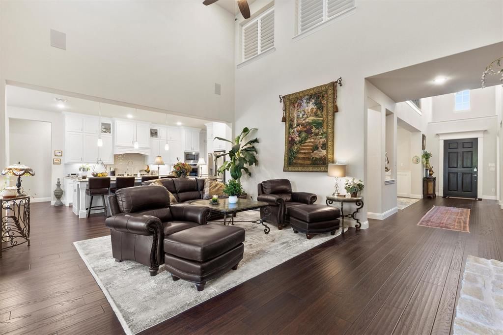 1870 Star Trace Parkway is an exquisite custom residence that defines elevated living. This 5-bedroom, 4.5-bath home with office or optional 6th bedroom lives like a luxury retreat. From the moment you step inside, soaring entry ceilings and architectural elements set the tone. The heart of the home is a spacious chef’s kitchen featuring a huge center island, 6-burner gas cooktop, double ovens, walk-in and butler's pantry. The island flows seamlessly to the family room with a dramatic stone fireplace, wood beams, built-in cabinets, and surround sound speakers. The main level hosts two luxurious primary suites; ideal for guests or multi-generational living. The primary retreat boasts California Closets and luxurious ensuite bath. Plantation shutters and exquisite trayed ceilings throughout add timeless elegance. Work and play blend effortlessly with a dedicated office, formal dining room, and an oversized utility room with a sink. Outdoor living is truly spectacular. The extended covered patio features a stunning wood-ceiling finish, a built-in kitchen and fireplace the backyard is fully landscaped for privacy perfect for alfresco gatherings or watching the game under the Texas sky. Storage and functionality extend to the 3-car garage with epoxy flooring and custom California Closet built-ins, ensuring organization without compromise. Upstairs, three additional spacious bedrooms include a Jack-and-Jill bath, while another bedroom enjoys easy access to a hall bath. The thoughtful layout allows comfort for family and guests alike. A custom media room complete with a “snack bar” with sink, microwave and mini fridge just outside and large bonus room upstairs are exquisite. Located in the highly regarded Star Trail community of Prosper, this home enjoys access to premier amenities and exceptional schools (zoned to Prosper ISD). Residents appreciate proximity to shopping, dining, entertainment and convenient access throughout the DFW area.