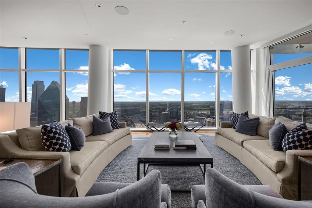 Enjoy magnificent sunrises and sunsets from this stunning 39th floor home in iconic Museum Tower. Unparalleled panoramic views capture the dramatic skylines and landmarks of both Uptown and Downtown Dallas. This rare home occupies a spacious half floor with 10’ ceilings throughout and private elevator access into the home. Custom, luxurious finishes include walnut hardwood floors by French Brown, Phillip Jeffries wallpapers, Waterworks fixtures, Bardiglio and Palisandro marbles, and Blue Iceberg calcite. Kitchen features Gaggenau appliances including microwave, warming drawer, double ovens, separate steam oven, dual dishwashers, refrigerator-freezer, and wine refrigeration. Lutron HomeWorks lighting and automated shades. Control 4 media system and climate control throughout. Ideal location overlooking beautiful Klyde Warren Park, the Pritzker Prize-winning architecture of Dallas Arts District’s performance venues and museums, and numerous restaurants. Available fully furnished.