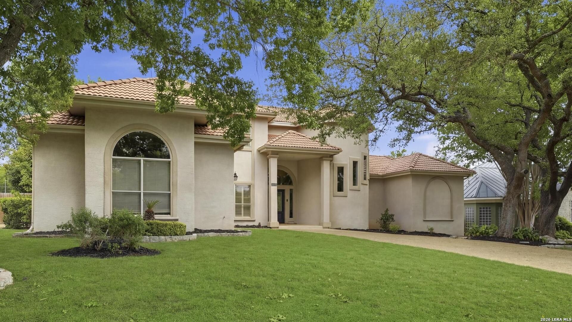 Welcome to this captivating, custom-built Burdick home located in The Fairways of Sonterra. This meticulously maintained 5-bedroom, 4.5-bath property blends timeless sophistication with a neutral color palette and natural materials, creating a welcoming ambiance throughout. The main floor features an exquisite primary suite, a secondary bedroom with a full bath (which could make an excellent office/study), formal dining and formal living room - all enhanced with elegant Plantation Shutters. Enjoy an open-concept layout with a dream kitchen, complete with stainless steel appliances, a spacious island, and abundant counter space, perfect for entertaining. The breakfast area and great room offer a warm, corner fireplace and large, sparkling windows that let natural light flow in throughout this home. Upstairs, discover three generously sized bedrooms, including one with its own private bath. The oversized garage provides ample space for vehicles and a golf cart, ensuring convenience for golf enthusiasts. Step outside to the expansive, private backyard designed for both relaxation and recreation. Enjoy cool breezes on the covered patio, a sparkling heated pool with spa and tranquil waterfall, and a private sport court/pickleball court for endless fun. Recent updates include a new main floor Water Heater, a new High Efficiency Water Softener system, a new Garage Door, Epoxy flooring in the garage, new Carpet in the master bedroom, LED lights, new Ceiling Fans, and more. This exceptional home offers the perfect blend of luxury and comfort - making it a place you may want to make your own.