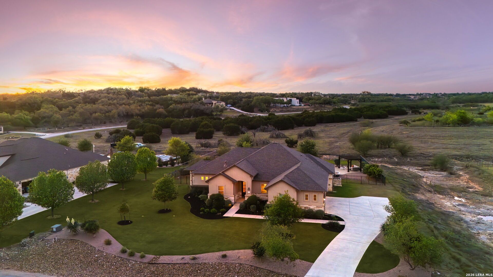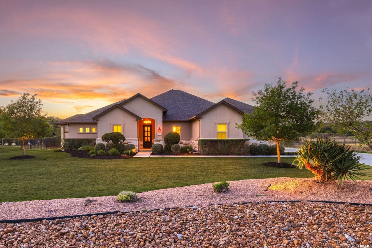 Nestled on over an acre in the prestigious community of Vintage Oaks, this exceptional luxury home offers the perfect blend of elegance, comfort, and resort-style living. From the moment you arrive, the beautifully manicured landscaping sets the tone for what awaits inside. Step into an open-concept design highlighted by soaring beamed ceilings and a stunning floor-to-ceiling rock fireplace that anchors the living space. The chefs kitchen is truly the heart of the home, featuring custom cabinetry, granite countertops, a gas cooktop, double ovens, stainless steel appliances, and an oversized island with a breakfast bar and striking rock accents-perfect for both everyday living and entertaining. A formal dining room and separate breakfast area provide versatile spaces for gatherings. The spacious primary suite is a private retreat, complete with bay windows, a large walk-in closet with custom built-ins, and a spa-like bathroom boasting a soaking tub, walk-in shower, and dual vanities. Each of the four bedrooms offers its own walk-in closet outfitted with custom shelving and drawers, while one secondary bedroom includes a built-in desk and Murphy bed-ideal for guests or a home office. Outdoors, the backyard transforms into your own private oasis. Enjoy a sparkling pool with a rock waterfall feature, a pergola, and a fully equipped outdoor kitchen-an entertainers dream designed for unforgettable gatherings. Additional highlights include custom window coverings throughout, a three-car garage, and an abundance of natural light that enhances every space. All of this, just minutes from the charm of New Braunfels, including dining, shopping, and the historic district of Gruene. With incredible neighborhood amenities and a truly breathtaking setting, this is luxury Hill Country living at its finest.