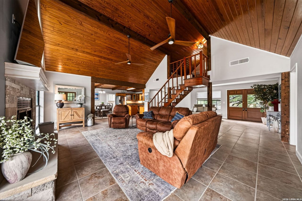 Escape to this beautiful home on Medina Lake where indoor-outdoor living is seemless. Though water levels are currently low, the views, peace, and tranquility are unbeatable. This gated property, fenced on three sides, feels like your own private retreat. The homes exterior was freshly painted in March 2026 and has seen numerous upgrades under the current owner. The kitchen features engineered hard wood floors with tile throughout the rest of the main floor. Tasteful contemporary colors and custom wood finishes give the home a warm, inviting feel. The primary bedroom is conveniently located on the main level, while a large "bunkhouse" suite downstairs includes a sitting area and full bath with equipped kitchen-ideal for guests or family gatherings. The living room on the main level boasts soaring wood ceilings, a cozy fireplace, and access to an expansive 1457 square feet of decks overlooking the lake area. Solid wood stairs lead to a charming loft bedroom above the living room. A spacious walk-in butlers pantry joins the kitchen and laundry area, offering both practicality and style. The homes beautiful wood ceilings and custom cabinetry add elegance and provide ample storage. There is also a large storage room accessible from both the downstairs and exterior of the home. Every room opens to the covered decks and outdoor spaces, including the primary bath. The property also features a majestic Century Oak, mature trees, a well house, and a quality, finished-out, oversized garage that is insulated, lighted, has 2 roll-up doors and a walk though door. Store your vehicles and toys or have a very large workshop! The lakebed behind the home has been developed so that when the water is up, it reaches the concrete bulkhead and boat ramp. Take in the natural beauty of the tall, wooded bluff, breathe some fresh air, and gaze at starry night skies. and when the lake returns, your exciting lake activities begin. Located just 20 minutes from Bandera, TX, this home is close to vibrant nightlife, shopping, restaurants, and all the charm that Bandera has to offer. A one-of-a-kind home offering comfort, craftsmanship, and the ultimate lakeside relaxation. Lots of great memories have been made here and now its your turn. The seller prefers Cash but will consider Owner Finance.
