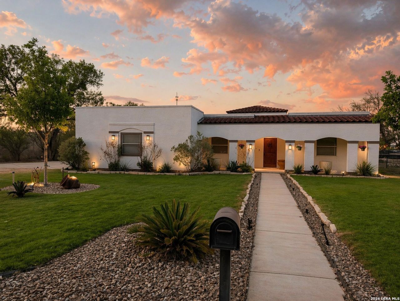 Welcome to 203 Harralton Circle - a stunning Spanish-style residence that immediately captivates with its timeless tile roof, warm architectural details, and truly exceptional curb appeal. Situated on a spacious corner lot in Devine, Texas, this 4-bedroom, 2-bath home offers the perfect blend of character, comfort, and outdoor living.From the moment you arrive, the front yard makes a lasting impression. Thoughtfully designed landscaping, newly planted oak trees, and a full irrigation system create a lush, manicured setting thats both beautiful and easy to maintain. The inviting walkway, accented with stone borders and soft lighting, leads you to a charming covered front entry that sets the tone for whats inside. Adding to the appeal is the privately wooded neighboring lot to the right, offering a natural buffer that enhances privacy and gives the home a more secluded feel. This property also stands out with its functionality and access. A long driveway leads to the oversized garage, providing ample parking and convenience, while a secondary entrance to the backyard offers added flexibility - ideal for extra vehicles, trailers, or easy backyard access. Inside, the open concept layout is designed for both everyday living and entertaining, offering a comfortable flow throughout. The oversized garage adds valuable space for storage, hobbies, or larger vehicles - a rare and practical feature. Out back, the home truly shines. A fully fenced yard provides privacy, while the extended covered patio creates the ultimate entertaining space. Whether you are hosting gatherings or enjoying quiet evenings, this outdoor area is ready to impress with its mounted TV, ambient hanging lights, and seamless access from the home - including private access from the primary suite. The primary bedroom serves as a relaxing retreat, complete with direct patio access and a spacious walk-in shower designed for comfort and convenience. Located within the well-established community of Heritage Park known for its spacious lots and neighborly feel, this property offers a sense of privacy and simplicity thats hard to find - with one way in and one way out, no HOA, and a setting where neighbors truly know each other. Conveniently located just a smooth 30-minute drive into San Antonio via I-35, this home offers the peace of small-town living without sacrificing accessibility to the city. This home delivers the perfect combination of standout curb appeal, functional living space, and an outdoor setup thats hard to find - all enhanced by thoughtful details that elevate both lifestyle and usability. Come tour your new home today!