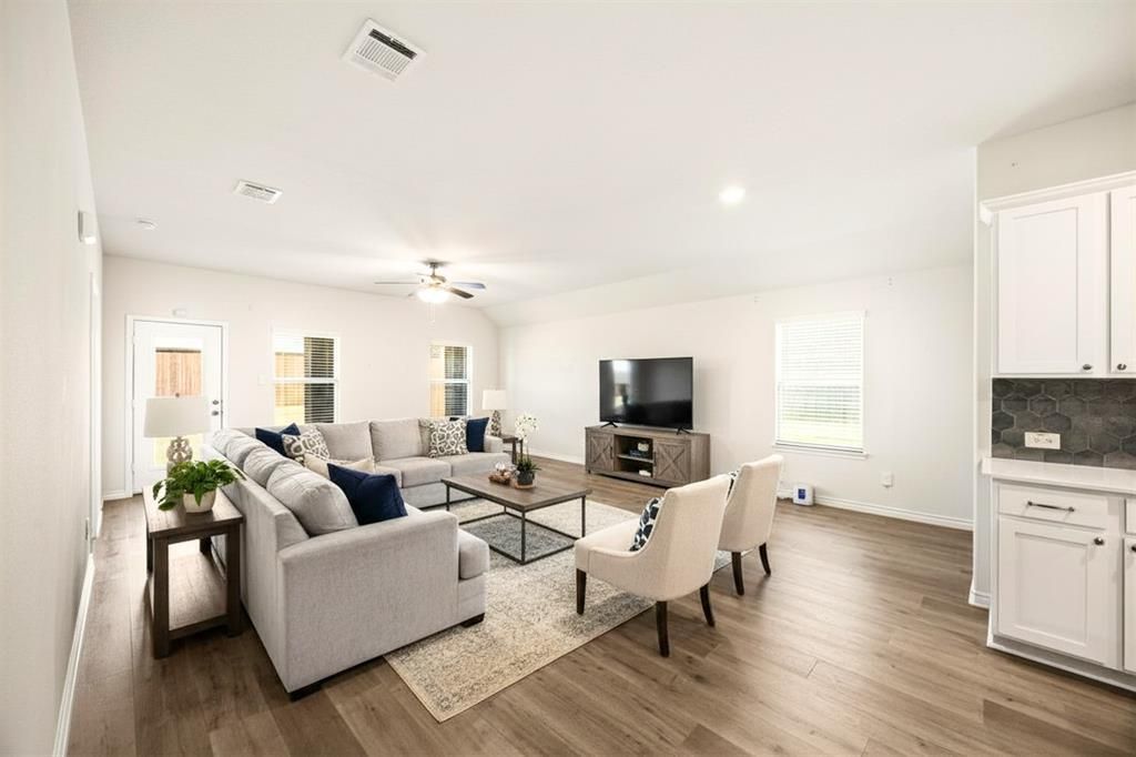 Located in the Master Planned community of Trailstone, this well-maintained 4-bedroom, 3-bath home features an open-concept layout with abundant natural light, hardwood flooring, and updated finishes throughout. The spacious living area flows into the grand kitchen with granite countertops, stainless steel appliances, large island, and white cabinetry, ideal for everyday living and entertaining. The primary suite offers dual vanities, an oversized walk-in shower, and large walk-in closet. The backyard features a covered patio with beautiful trees, perfect for outdoor enjoyment. Conveniently located near IH-30, there is shopping, dining, and lake access. Enjoy outdoor living in the spacious backyard perfect for relaxing or hosting gatherings.
