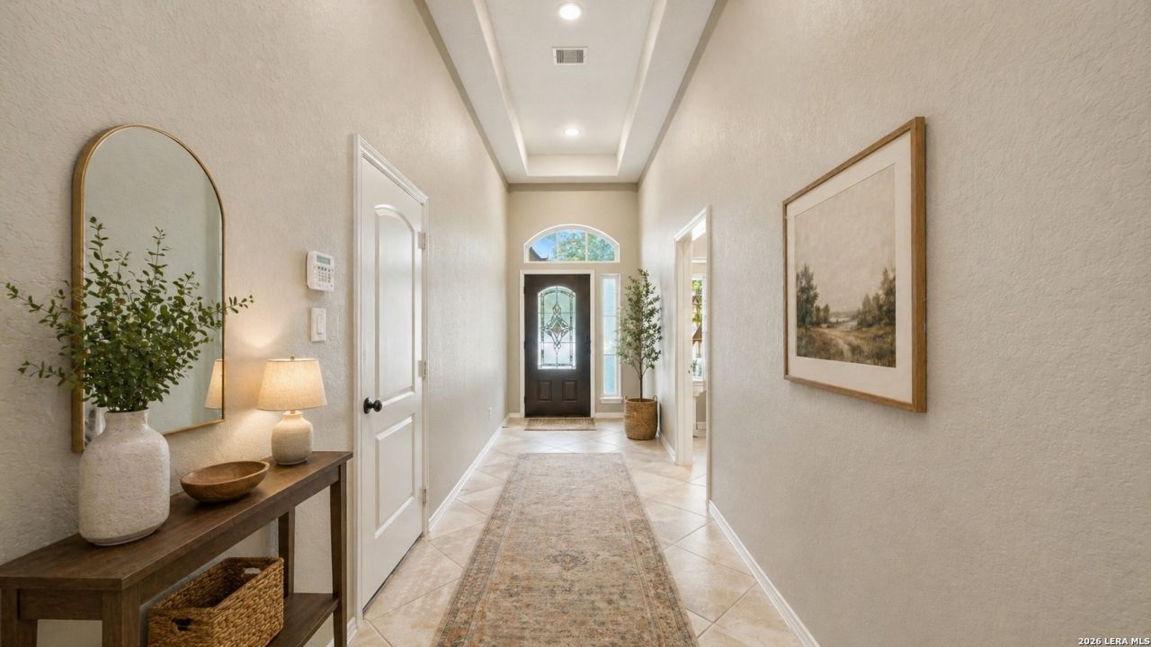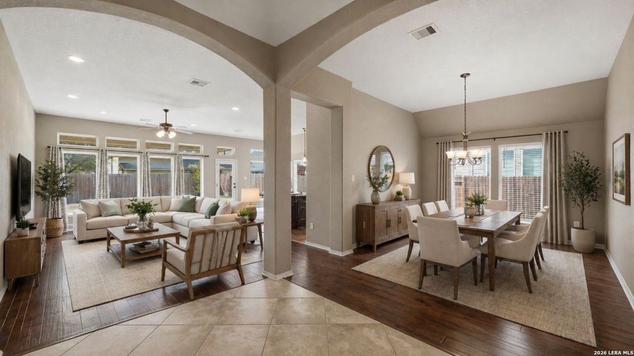 Located in the desirable Mill Creek Crossing community, this beautifully maintained one-story home offers the perfect combination of comfort, style, and functionality. Featuring 4 bedrooms and 2 bathrooms, the thoughtfully designed open-concept layout is enhanced by soaring 12-foot ceilings and a light, neutral color palette that creates a bright and inviting atmosphere throughout. The spacious living area overlooks the backyard and seamlessly connects to the kitchen-ideal for both everyday living and entertaining. The kitchen is a true centerpiece, complete with a large island, breakfast bar, walk-in pantry, and a charming breakfast nook. A formal dining room provides the perfect setting for hosting gatherings and special occasions. Step outside to your private backyard retreat, where a covered patio, well-maintained lawn, and privacy fence offer a peaceful space to relax or entertain. Move-in ready and located in a quiet, established neighborhood-this home checks all the boxes. Schedule your private showing today!