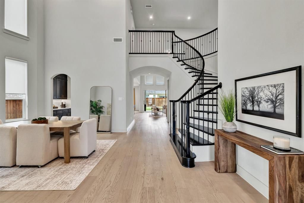 Welcome to luxury living in one of Prosper's most sought-after communities. This custom Toll Brothers masterpiece in the prestigious Star Trail neighborhood is the definition of refined elegance. Step through the front door and be immediately captivated by a grand winding staircase soaring beneath dramatic high ceilings — a breathtaking first impression that sets the tone for the luxury that unfolds throughout. White oak wood flooring flows seamlessly through the main living areas, adding warmth and timeless sophistication.Spanning an expansive 4,574 square feet, this 4-bedroom, 4.5-bath residence was designed for those who refuse to compromise. At the heart of the home lies a chef-inspired kitchen— anchored by a grand oversized island, outfitted with professional Wolf appliances, and featuring double ovens and a 6 burner gas cooktop. You also have a butler's pantry and walk in pantry.The open-concept layout flows effortlessly to a show-stopping sliding glass wall that dissolves the boundary between indoors and out — perfect for entertaining on the covered patio or simply soaking in the Texas evenings.The main floor offers everything you need without ever climbing a stair. Retreat to the primary suite, a true sanctuary featuring a spa-inspired en suite bathroom designed to pamper and restore. A second bedroom with its own private en suite bath provides ideal accommodations for guests or multigenerational living. A dedicated home office is away from the main areas.The private theater room outfitted with a premium 13-speaker surround sound system delivers a cinematic experience at home along with the projector and screen that stays with the home.Star Trail residents enjoy resort-style amenities including pools, tennis courts, walking trails, and a vibrant community atmosphere — all within the top-rated Prosper ISD. The PGA headquarters and the anticipated Universal Kids Resort is just a short drive away.This is more than a home. It's a lifestyle.