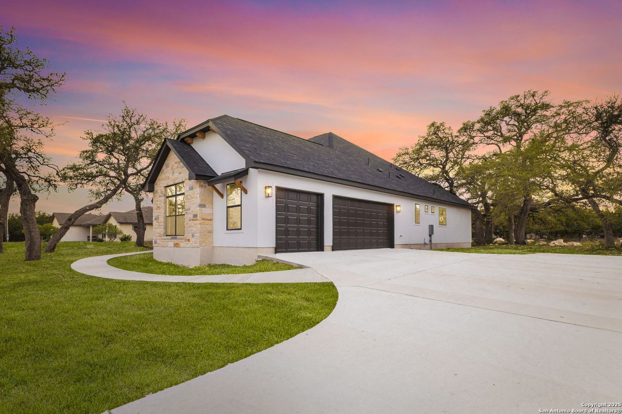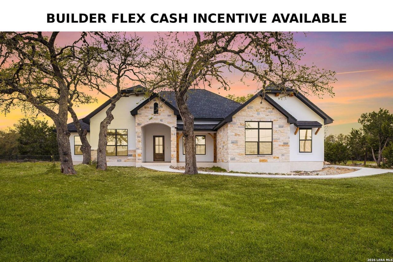 Discover this stunning new construction Hill Country modern, perfectly set on a flat 1-acre lot surrounded by mature trees-just minutes from the lake. This single-story 4-bedroom, 3-bath home offers a highly functional layout with spacious bedrooms and an abundance of natural light throughout. The chefs kitchen is a true centerpiece, featuring a large island, custom cabinetry with hardware, and built-in stainless steel appliances. The breakfast area is elevated with a built-in bar, ideal for entertaining. The primary suite is a private retreat, showcasing tray ceilings, direct backyard access, and a spa-inspired bath with a soaking tub and separate walk-in shower. For added convenience, the laundry room connects directly to the primary suite. A secondary bedroom with its own en-suite bath and private exterior access is perfectly positioned for future pool use or seamless indoor-outdoor entertaining. The home also includes a dedicated office, ideal for working from home. Complete with a 3-car side-entry garage and a peaceful, private setting-this is Hill Country living at its finest.