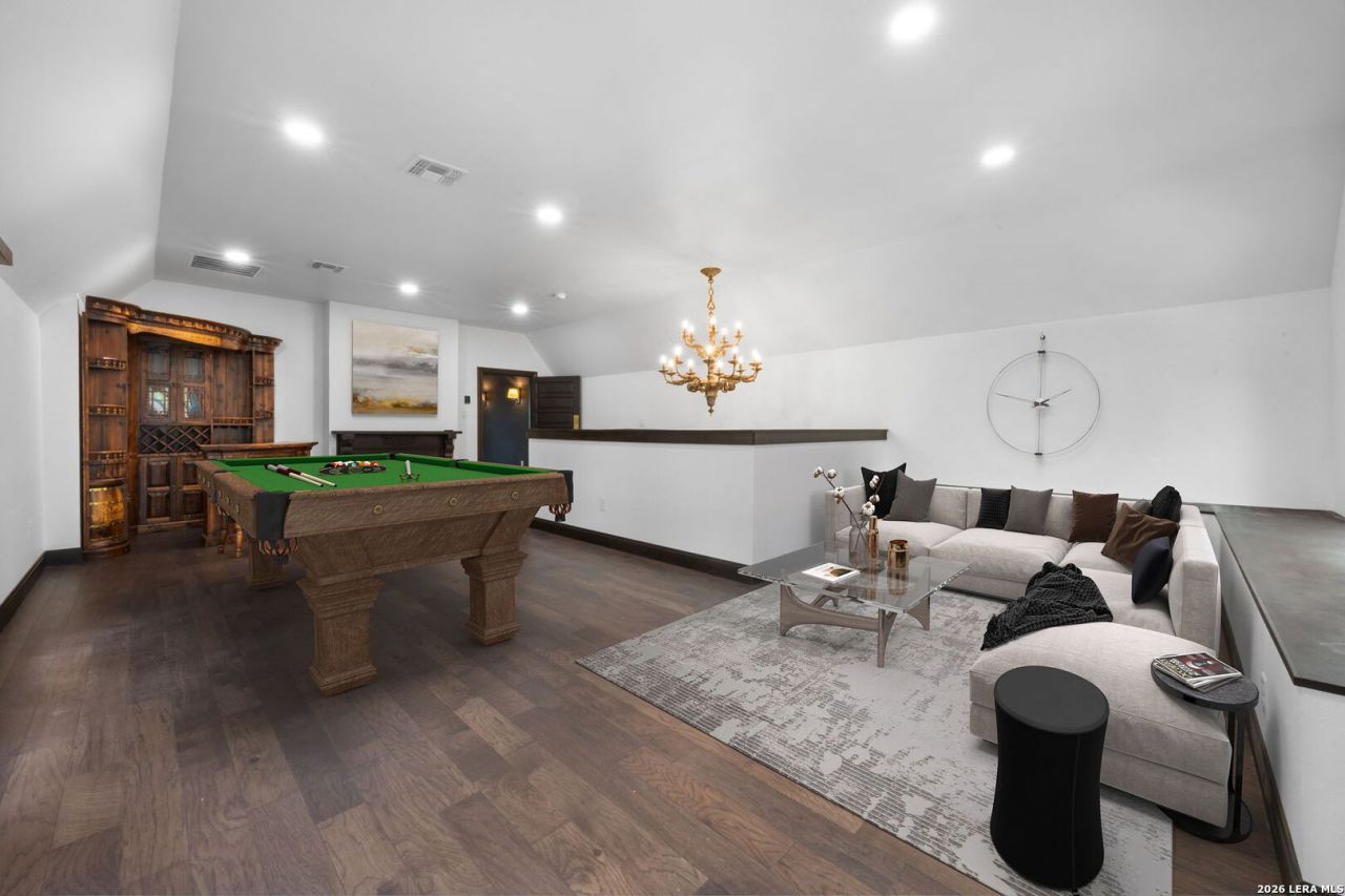Set on nearly an acre in the heart of Hollywood Park, this fully reimagined Tudor style estate blends timeless character with modern scale and functionality. The main residence offers approximately 5,745 square feet, complemented by an attached private apartment of 810 square feet, for a combined total of 6,556 square feet of living space. A separate 773 square foot detached casita provides additional flexibility. The main home features expansive living spaces filled with natural light, anchored by a dramatic rock fireplace and framed by large picture windows. A flexible layout includes multiple living and dining areas, a dedicated media and game room, and seamless flow for both everyday living and entertaining. The attached apartment includes its own kitchen, laundry, and bedroom, making it ideal for guests or extended family. The detached casita functions as a true second residence, complete with a full primary suite, kitchen, laundry, and loft, perfect for multigenerational living or long term stays. This is more than a renovation, it is a full scale transformation. Major upgrades include all new plumbing, electrical, HVAC systems with four units, windows, roof, stucco, and exterior stonework. The foundation has been leveled, the fireplace expanded, and the home is fully spray foam insulated for maximum efficiency. Thoughtful details carry throughout, including refinished original chandeliers and custom exterior lighting with 13 newly installed lampposts that create a resort style setting across the property. The grounds are fully enclosed by a striking rock wall, offering both privacy and presence. In addition to the living spaces, the property includes a 1,225 square foot workshop or storage building and an additional 129 square foot storage room near the carport, providing ample space for hobbies, equipment, or future customization. A three car carport, covered patio, and expansive outdoor areas complete the setting. Centrally located with quick access to Highway 281 and Loop 1604, and just minutes from premier shopping and dining, this is a rare opportunity to own a truly one of a kind estate in one of San Antonios most established and sought after neighborhoods.