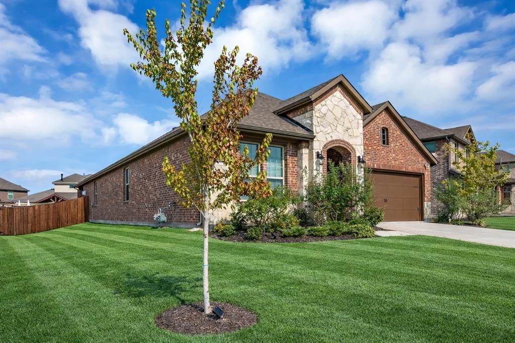 Welcome to this beautifully maintained 2021-built home in the highly sought-after Lakeside at Heath community, zoned to top-rated Rockwall ISD and just a short walk to Linda Lyon Elementary. Nestled in a quiet, serene neighborhood, this property offers a rare combination of modern comfort and a peaceful, nature-filled setting.Situated on a desirable oversized lot, this single-story home features 4 bedrooms and 3 full baths with an open, airy layout and soaring 10-foot ceilings. Wood-look tile flooring flows throughout the main living areas, enhancing both style and durability.The heart of the home is the gourmet kitchen, seamlessly connected to the living and dining spaces—perfect for everyday living and entertaining. It features quartz countertops, a stylish tile backsplash, gas cooktop, built-in ovens, stainless steel appliances, and a large island with sink and breakfast bar.Abundant natural light in the expansive living and dining areas. The spacious primary suite offers a relaxing retreat with a spa-inspired bath, dual sinks, and a glass-enclosed shower.What truly sets this home apart is its proximity to Lake Ray Hubbard and the scenic community lakes, offering beautiful water views and a calm, tranquil environment. Just minutes away (approximately 0.5 mile), you can enjoy boating, sailing, lakeside walks, and breathtaking sunsets. The neighborhood itself is known for its peaceful atmosphere and picturesque surroundings, making it an ideal escape from the city while still staying conveniently connected. Additional features include a tankless water heater, full rain gutters, and an EV charging outlet in the garage. With easy access to Highway 80 and nearby shopping and dining, this home truly offers the best of both convenience and lifestyle.A rare opportunity to enjoy lakeside living in a calm, welcoming community—this is one you don’t want to miss.