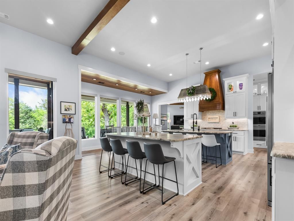 Tucked inside the gated enclave of Tanager Springs in between Denison and Sherman, Texas, this five-year-old residence captures the quiet elegance and easy sophistication that define Southern living at its best. Set on a full acre framed by mature hardwood oak trees, the home welcomes you with a sense of space, light, and thoughtful design that feels both refined and relaxed.Step inside to a sweeping open floor plan crowned by vaulted ceilings, where natural light pours through a wall of windows stretching across the back of the home. These expansive views invite the outdoors in, offering a daily backdrop of wide Texas skies and gently swaying trees—an ever-changing landscape that feels like your own private retreat.At the heart of the home, the kitchen is as functional as it is beautiful. Dual islands topped with striking leathered granite create the perfect gathering space, whether hosting a lively weekend brunch or a quiet evening supper. Abundant cabinetry and a spacious walk-in pantry ensure everything has its place, blending practicality with polished style. The open dining area flows seamlessly alongside, ideal for both intimate meals and larger gatherings.The primary suite is a sanctuary unto itself, thoughtfully positioned apart from the secondary bedrooms for ultimate privacy. Its luxurious ensuite bath offers a spa-like escape, designed for unwinding at the end of the day. Meanwhile, a second living area provides a flexible space perfect for movie nights, gaming, or simply relaxing with loved ones.A three-car garage adds convenience, while the expansive lot offers endless possibilities—from garden parties under the oaks to peaceful mornings with coffee on the patio.In North Texas, where charm and community meet wide-open spaces, this home embodies a lifestyle that feels both elevated and warmly familiar—an invitation to slow down, settle in, and savor every moment.