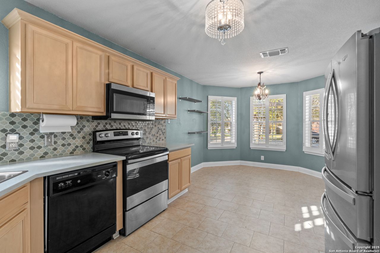 Adorable single-story home with mature trees. Vinyl "wood" flooring throughout with combination of tile for easy clean up and a cozy warm feel. The living room showcases built in shelves and fan and opens to back yard. The kitchen offers sleek black annd stainless steel appliances with a built-in microwave, smooth top range, and an upgraded pantry door. The cute breakfast nook off the kitchen has a bay window. The laundry room is located off the Kitchen and also gives access to the HVAC system. The primary bedroom has a walk-in closet, vaulted ceiling with fan, and an 1-suite bathroom with double vanity, garden tub, and a separate shower. Covered patio in backyard perfect for relaxing at the end of a long day. There is a two-car garage ith an opener and electric water heater. Two refrigerators are included, one in the garage and a nice double door with pull out freezer in the kitchen. The home also includes a washer and dryer. This clean home is ready for its new owners to easily move in and begin to enjoy their new home.