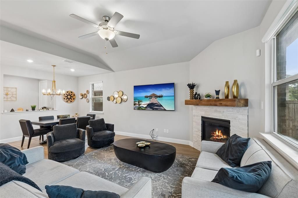 Elegant and inviting, this 4-bedroom, 3.5-bath home in Sachse offers a spacious layout designed for both everyday living and effortless entertaining. From the moment you enter, you and your guests are welcomed by a warm and open atmosphere. A formal living room provides a versatile space for hosting or relaxing. At the heart of the home, the main living area features a stately fireplace and flows seamlessly into the dining area, bar space, and kitchen—creating a connected environment ideal for gatherings. The thoughtfully designed kitchen showcases a large island with seating, built-in stainless steel appliances, a walk-in pantry, and stylish designer finishes. The serene primary bedroom on the main level offers a peaceful retreat, complete with an ensuite bath featuring dual sinks, a separate shower, and a spacious walk-in closet. Upstairs, generously sized secondary bedrooms share access to a full bath, along with an additional living area and a flexible media room that can adapt to your needs. Outdoors, enjoy a private backyard with a covered patio, perfect for relaxing or entertaining year-round. Ideally located, this home provides convenient access to nearby parks, as well as a variety of shopping and dining options. 3D tour available online!