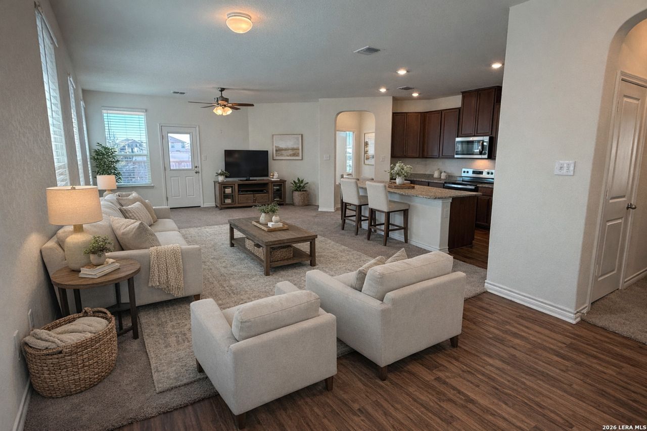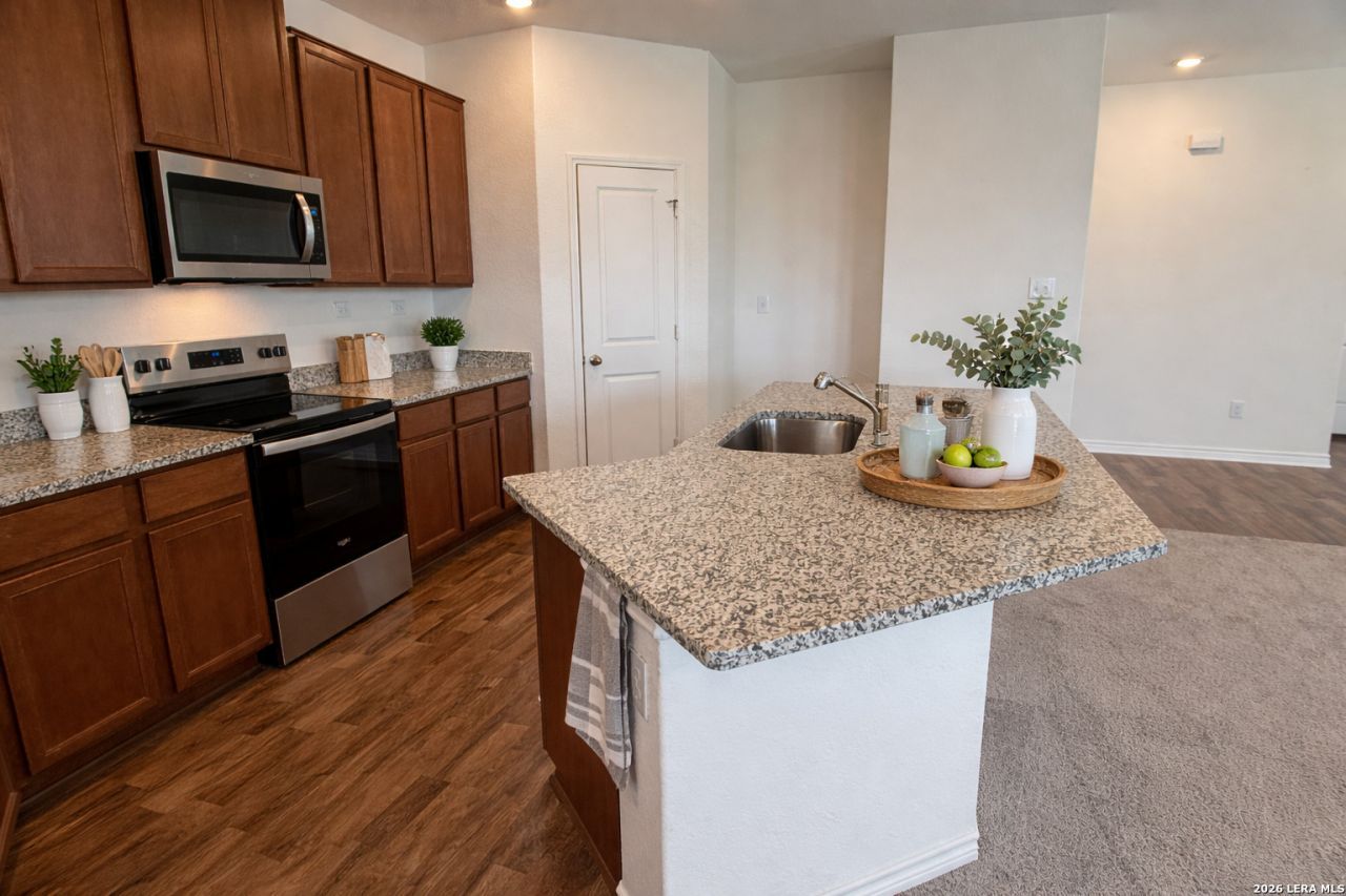 *Move in ready 3/2 single story home*4.5 Miles to IH 35. Walking Distance to the Community Pool on street behind home. 9 foot ceilings, spacious sized bedrooms, linoleum and carpet flooring. Kitchen includes: s/s dishwasher, built in s/s microwave, stove/ oven range electric, granite kitchen counter tops, breakfast bar, drinking water filter, recessed lighting & pantry 2" faux blinds. Other Features: split bedroom floor plan, primary has a large walk in closet / walk in shower / double vanities, hall bath is shower / tub combo & 1 vanity with makeup area, laundry room, walk in closets, prewired bedroom switches for ceiling fans, garage door opener, sprinkler system, water softner, 12x9 covered patio in fenced back yard. NBISD This property is zoned and is within walking distance of Longcreek Highschool in NBISD and Legend Point Elementary.