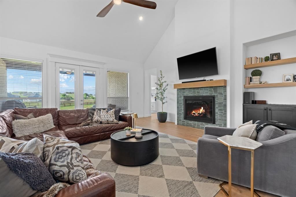 Built in 2023, this custom-built Our Country Homes single-story residence offers 4 bedrooms, 3.5 bathrooms, and 3,879 square feet on 1.84 acres with a 3-car side-entry garage. This home features an open-concept layout with dedicated spaces including a private study, game room, media room, and second living area, designed for both everyday living and entertaining. The main living area includes a fireplace with gas logs and starter, high ceilings, decorative lighting, and expansive windows providing natural light and views of the surrounding acreage. The kitchen is designed with a large island, gas cooktop, electric oven, microwave, dishwasher, disposal, pantry storage, and open flow into the dining and living areas. Interior features include walk-in closets, double vanities, high-speed internet availability, and multiple functional living spaces. Recent upgrades include perimeter fencing, interior lighting upgrades, exterior uplighting, custom built-ins in the family room and media room, approximately 8,000 square feet of added grass with additional sprinkler heads, an added play area, a whole-home water filtration system, UV lights on the air system, a switch installed for an RV and generator, and a built-in switch for the heat lamp at the well. Exterior features include a large covered patio, expansive backyard space, landscaped grounds, sprinkler system, rain gutters, and lighting. The property is serviced by propane, septic, and well systems and is situated on an interior acreage lot within Sandstrom Ranch, minutes from Eagle Mountain Lake. This Fort Worth property provides convenient access to major roadways including US-287 and I-35W, with proximity to retail, dining, and employment centers throughout the north Fort Worth area.