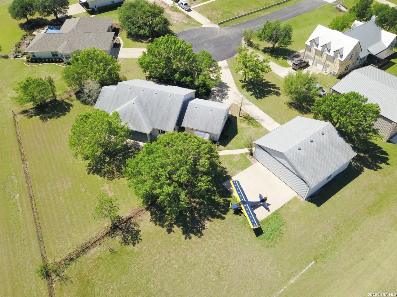 Live Where You Land. Highly sought-after Cross Country Estates (07TS)-a private aviation community just 7 miles east of Georgetown. 4.4 miles from Toll 130, quick access to Austin, San Antonio, and Dallas. Well-maintained 2,773 x 75 grass runway (18/36) with excellent drainage and TrueGrid reinforced turf, allowing for reliable, all-weather operations. Additional amenities include runway lighting (pilot-controlled via Unicom 122.9) and a visual glide slope indicator. Every home is designed with aviation in mind, complete with a private hangar, and the neighborhood thrives on a shared passion for flying. This property is one of the most desirable lots in the airpark, ideally located at the end of a quiet cul-de-sac and backing directly to the runway-right near the touchdown zone for Runway 18. Set on a spacious 0.84-acre lot. Beautifully landscaped with mature trees (oaks, crepe myrtles, cypress) and vibrant flower beds, recently enhanced with decorative rock and mulch. The Hangar: A pilots dream setup: 42 x 40 insulated hangar with 40 automatic door (recently serviced) Running water and loft storage, Dedicated electrical panel with multiple 110V & 220V outlets 9 x 10 rear access door for RV, boat, or trailer storage. Brick exterior Home: Custom-built and meticulously maintained, this 2,232 sq ft home offers: 3 bedrooms | 2.5 baths | 2-car garage Spacious layout with oversized rooms, wide doorways, and abundant storage 9 ceilings throughout & solid wood interior trim Energy-efficient Andersen wood windows Recent upgrades include: New HVAC (2023), Professional-grade water heater (2025), Granite kitchen countertops (2021), Updated plumbing fixtures and shutoff valves, New interior door hardware (2024) Exterior paint and sealing completed by professionals, Additional features: 33 x 12 covered back porch with ceiling fans-perfect for watching aircraft operations, Greenhouse, Construction plans and build photos included.