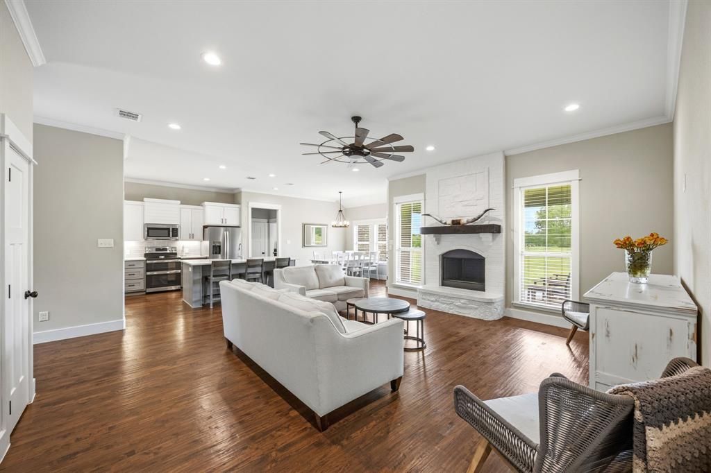 Enjoy peaceful country living on 1.58 acres in Lone Oak, TX with this spacious and inviting 5-bedroom home (one bedroom currently used as an office). Offering a perfect blend of comfort and functionality, this property provides room to spread out while still enjoying modern conveniences.Inside, you’ll find an open floorplan enhanced by hand-scraped hardwood floors throughout the main living areas and carpet in the bedrooms for added comfort. The cozy living room features a beautiful painted brick and stone fireplace with a raised hearth, creating a warm focal point that can be enjoyed throughout the main space—perfect for chilly evenings. The kitchen is designed for both everyday living and entertaining, showcasing quartz countertops, a center island with seating, stainless steel appliances, and a convenient pantry for extra storage. The primary suite offers a relaxing retreat with a spacious layout and a large walk-in closet. The primary bath includes dual sinks, a garden tub, and a separate shower, providing both comfort and functionality. A utility room with built-in cabinets adds even more convenience. Step outside to a covered back patio overlooking a huge backyard, perfect for outdoor gatherings or simply enjoying the serene setting. The property also features a picturesque pond, adding to the charm and natural beauty of the land. Garage features epoxy flooring. With generous space, thoughtful features, and a tranquil setting, this Lone Oak property offers the ideal balance of country living and modern comfort. Plus, it is zoned to highly sought after Lone Oak ISD! Lone Oak High School has recently completed a redesign that added enhanced athletic facilities, science and health labs, a band hall, concession and dining areas, and an ag barn with instructional space. Don’t miss your chance to make it yours!