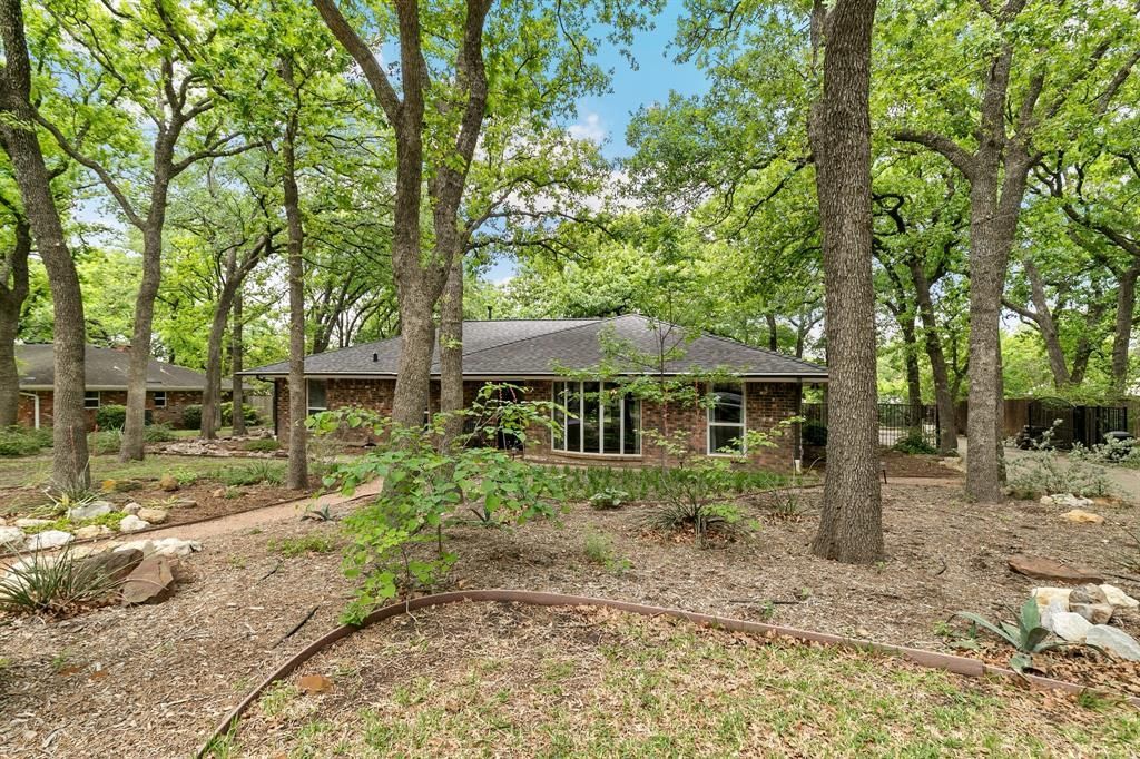 Tucked beneath a canopy of mature trees in Desirable Rustic Oaks Addition, this home offers the perfect blend of charm, character and a peaceful, nature-inspired setting. Beautiful natural Texas landscape giving serene views from nearly every room. Welcome Home to an inviting open layout where your entry and dining space flow effortlessly into the main living area. The showstopper? A stunning floor-to-ceiling brick gas log fireplace paired with gorgeous tongue-and-groove wood ceilings, exposed beams, and rich trim details—bringing true architectural flair with industrial enhancements throughout the home. Unique decorative lighting adds personality and style. Dining area features a large bay window that fills the home with natural light. Enjoy window views from your eat-in kitchen, complete with granite countertops, decorative backsplash, stainless steel appliances, an abundance of cabinet storage plus a charming built-in hutch with character. The oversized primary suite offers a true retreat, with a modern ensuite bath featuring dual sinks, a third vanity space, and a spacious walk-in shower. Secondary bedrooms and bathrooms are also generously sized, providing comfort and flexibility. The home has recently been refreshed with new paint and thoughtfully maintained throughout—Pride of Ownership truly shines. Adding peace of mind to this home - Seller completed a pre-listing inspection and addressed items to ensure the home is in excellent safe condition for the next owner. Step outside and unwind in your own private outdoor oasis, featuring an oversized patio, extended decking, and a cozy cobblestone firepit area—Garden beds include their own irrigation system giving easy maintenance. Additional highlights include a smart thermostat, front-load washer and dryer that convey, a manual iron driveway gate, French drains, sprinkler system, rain gutters, and radiant barrier for added efficiency. This home is truly move-in ready!