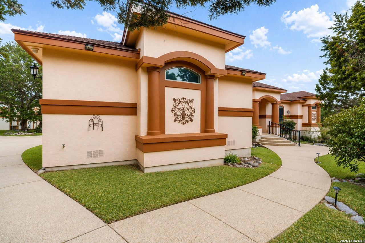 Elegant Mediterranean-style estate set on 3.38 acres in the heart of Texas Hill Country, offering a rare blend of privacy & thoughtful upgrades throughout. This expansive single-story home spans 3,061 square feet & features a desirable split floorplan w/3 bedrooms & 3 full baths with two of the bedrooms being luxurious primary suites. A spacious study w/French doors provides the perfect work-from-home retreat, while the oversized living area impresses w/ soaring ceilings, a stunning dual fireplace, and custom built-in shelving & cabinetry. The fireplace seamlessly connects to a bright and inviting sunroom, creating a warm & versatile space for relaxing or entertaining. The chefs kitchen boasting a massive island, custom glass-front cabinetry, gas cooking, breakfast bar, oversized pantry, & two advanced filtration systems including reverse osmosis. A separate dining area & sunroom both overlook the expansive back decking, complete w/ a swim spa & hot tub-perfectly positioned to take in the peaceful Hill Country surroundings. This meticulously maintained home includes numerous recent updates: all windows replaced in 2024, dual HVAC systems replaced in 2020 and includes an integrated dust removal system, and new wood and carpet flooring installed in 2026. The property is equipped with a private water well supported by an additional 2,500-gallon storage container, as well as a water softener system with dual tanks. Outdoor features continue to impress with a three-car garage, circular drive & three custom sheds- all with electricity, including one air-conditioned unit. The decking was fully rebuilt in 2025, and a 200-foot firebreak has been added for enhanced safety. Experience serene, upscale Hill Country living with this exceptional, fully upgraded property-truly a must-see to appreciate all it has to offer.