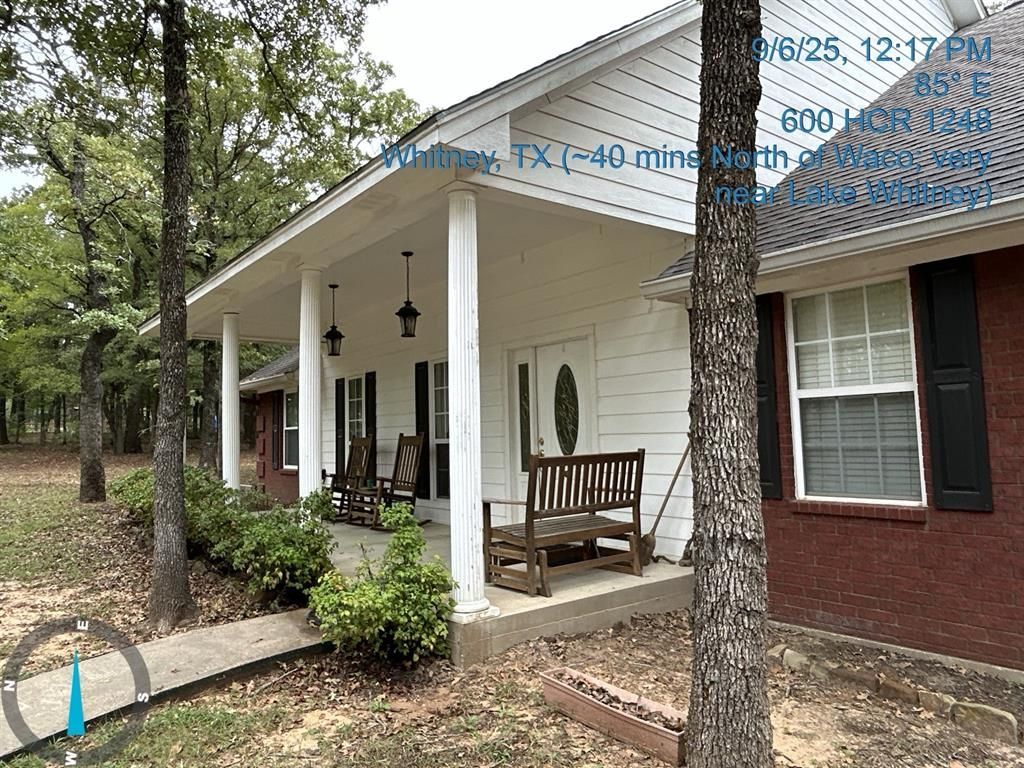 Discover serene, park-like living in this beautifully maintained 3-bedroom 2-bath home featuring a 2-car garage and sweeping views framed by mature post oaks, cedar elm, and hickory trees scattered throughout the grounds. The gated entrance, equipped with solar and electric power, leads to a spacious circular drive offering convenience and curb appeal. New fencing encloses the entire perimeter. Inside, the thoughtfully designed kitchen showcases granite countertops, pull-out drawers, under-cabinet lighting, and abundant storage- perfect for everyday use and entertaining. The split floor plan provides privacy with a generous primary suite featuring a large master bath and his and hers closets. The attic includes a fully insulated, electrically equipped bonus room, providing the perfect climate-controlled storage space. Additional highlights inside include a formal dining room, breakfast nook, large home office and large utility room both equipped with pocket doors, tray ceilings, a plethora of storage, and a striking brick fireplace with a propane starter for wood-burning ease. The backyard features a wooden deck and back porch TV access, ideal for entertaining. A substantial 20x30 workshop, equipped with electric and water, ceiling-mounted air hose reel, and an attached awning, offers an exceptional workspace. Adjacent to the workshop is a freestanding carport to provide additional parking. Toward the rear of the property, you'll find several scenic nature trails, a small gully, and thoughtfully cleared, picnic-style areas that enhance this property's natural charm. Ideally situated just minutes from Lake Whitney, the property offers convenient access to both Waco (approx. 40 min drive) and the Dallas-Fort Worth metroplex (approx. 1 hr drive), placing it in a highly desirable, strategically located area. This property blends comfort, functionality, and natural beauty, ideal for anyone seeking peaceful surroundings without sacrificing modern amenities.