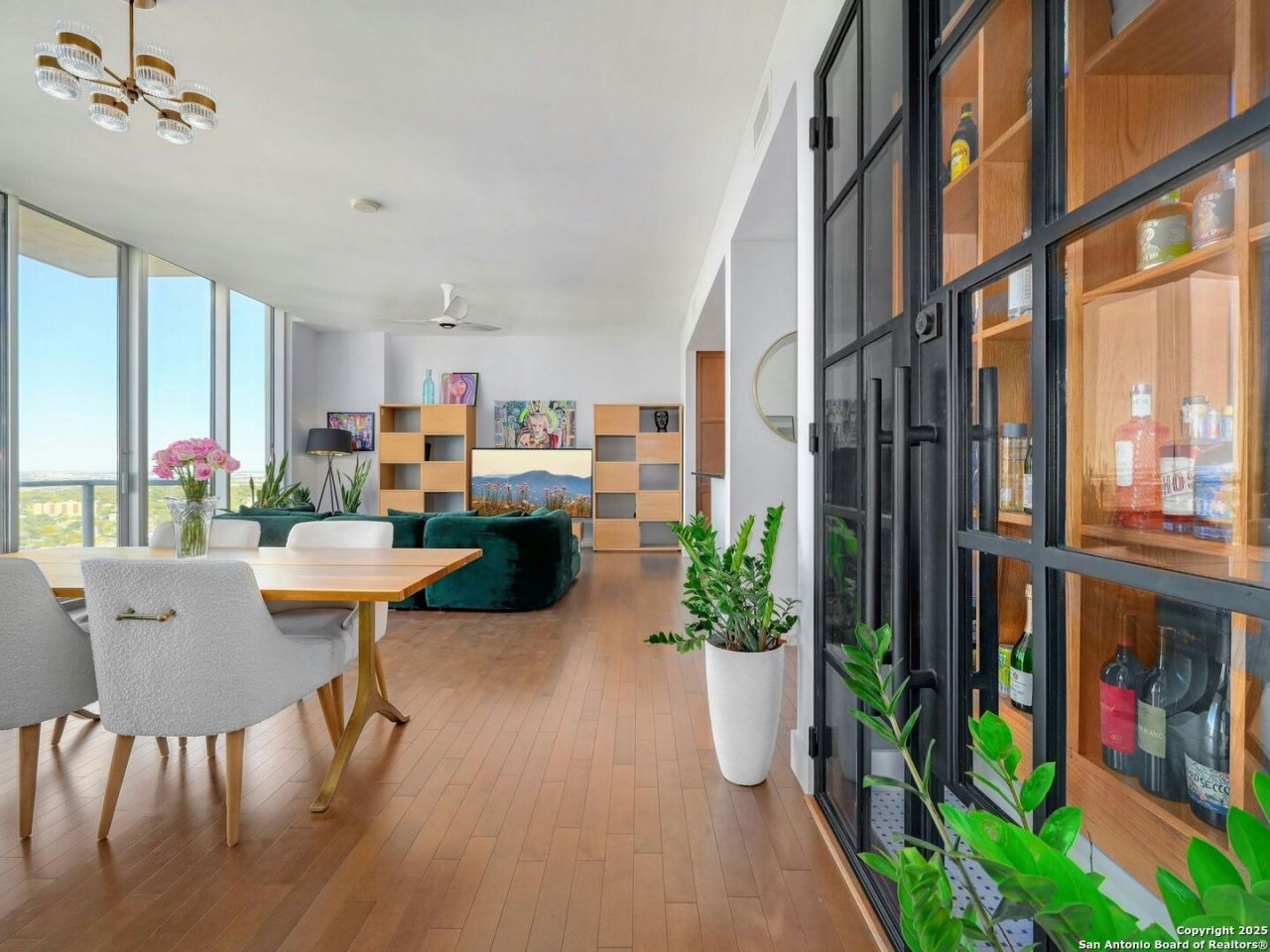 Experience elevated living in this exceptional 3-bedroom, 2.5-bath residence, ideally positioned atop the prestigious Grand Hyatt San Antonio. Located next to Hemisfair Park, this 28th-floor condominium spans 1,837 square feet and offers a seamless blend of sophistication and contemporary urban style. Thoughtfully renovated with a refined, modern aesthetic, the open-concept floor plan is framed by expansive floor-to-ceiling windows, capturing sweeping skyline views and filling the interiors with natural light. The flexible third bedroom is currently styled as an oversized office, offering versatility as a media room, study, or additional living space, with an ambiance reminiscent of a SOHO House inspired setting. The gourmet kitchen is impeccably appointed with a Thermador gas range, Sub-Zero refrigerator, and generous prep space, perfect for both everyday living and entertaining. The primary suite serves as a serene retreat, featuring custom wood paneling, designer lighting, and elevated finishes throughout. Its spa-inspired bath offers dual vanities, an oversized walk-in shower, a separate soaking tub, and a meticulously designed walk-in closet. Additional highlights include two reserved parking spaces and a private storage unit. Residents enjoy premier amenities, including 24-hour concierge service and a rooftop pool with panoramic views of the San Antonio skyline. Set in the heart of downtown, this residence provides immediate access to world-class dining, entertainment, and cultural destinations, offering a lifestyle defined by luxury, convenience, and distinction.