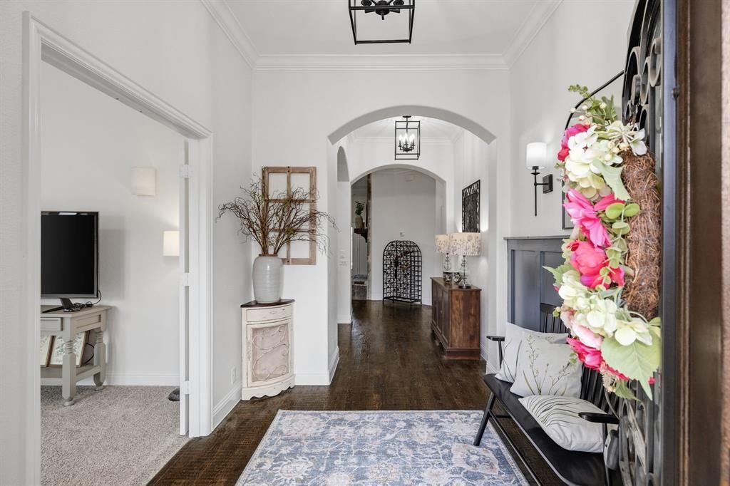 Welcome to this beautifully maintained 3 bedroom, 2 bathroom home with a dedicated study, built in 2020 and ideally situated on a quiet cul-de-sac in one of the fastest growing areas in North Texas. Inside, you'll find real hand-scraped wood floors flowing through the main living areas, complemented by crown molding, decorative lighting, and fresh interior paint that create a warm and inviting atmosphere. The spacious living room is anchored by a stunning full stone fireplace with a cedar block mantle and raised hearth, making it the perfect focal point for relaxing or entertaining. The kitchen features granite countertops, ample cabinetry, and a functional layout that opens seamlessly to the living and dining spaces. Two generously sized guest bedrooms and a private study offer flexibility for family, guests, or a home office. All windows are energy efficient, with tinted windows in the living area providing added privacy and comfort. Step outside to enjoy the large covered patio overlooking a fenced backyard, ideal for outdoor dining, gatherings, or simply unwinding. Additional highlights include a sprinkler system and an epoxy coated garage floor. The community includes access to a swimming pool, tennis courts, and walking trails. Located in a prime and rapidly developing corridor near the PGA headquarters and the future Universal Studios theme park, this home offers incredible access to shopping, dining, and entertainment while still maintaining a peaceful neighborhood feel. Zoned for the highly prestigious Prosper ISD. Don’t miss the opportunity to own a move-in ready home in one of North Texas’ most exciting growth areas.