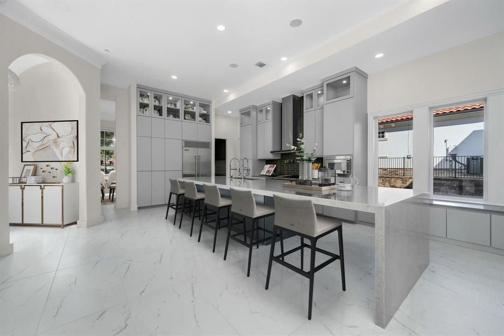 Set on an expansive 0.62-acre creek lot, this beautifully updated estate offers privacy, mature trees, and serene views. Step inside to a bright foyer that opens to elegant formal living and dining spaces with abundant natural light, plantation shutters, and refined finishes. The study features custom built-ins, detailed wall molding, and its own fireplace. The redesigned kitchen is a standout with an oversized island, Viking appliances including double ovens, farmhouse sink, pot filler, and coffee bar with wine fridge. It flows seamlessly into the spacious family room with fireplace and backyard views. The primary suite overlooks the backyard and features a fully remodeled spa-like bath with dual vanities, soaking tub within a large walk-in shower, and custom closet. Upstairs offers versatile living with a game room, built-in desk area, and media room complete with bar, fridge, and projector setup. Secondary bedrooms include en-suite baths, while one features balcony access with peaceful views. Outdoor living is exceptional with a large covered patio, built-in kitchen, and a resort-style pool and spa with water feature. The backyard backs to a creek and green space, creating a rare, tranquil setting. Extensive 2025–2026 updates include HVAC systems, water heaters, kitchen redesign, remodeled baths, new flooring, fresh paint, landscaping, and more. Located in the prestigious, gated Starwood community, residents enjoy 24-hour security, tennis courts, community pool, clubhouse, scenic trails and greenbelts, all minutes from the Dallas North Tollway, The Star, Legacy West, and Frisco’s premier dining, shopping, and entertainment.