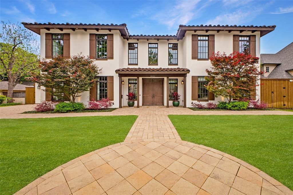 Stunning, clean-lined Mediterranean Revival in exceptional location of Preston Hollow near St Marks, Central Market, Northpark, etc. The light-filled, inviting interior offers an open floorplan with authentic architectural features such as beamed ceilings, arched doorways, 10-inch baseboards, and wrought iron staircase & sconces, all creating a lighter feel. Fabulous space is offered in the most popular areas of the home – the kitchen, breakfast room, and living room. A large center island, breakfast bar, walk-in pantry, and Wolf & Sub-Zero appliances highlight the gourmet kitchen. The magnificent 2 story study-library is a focal point of the downstairs providing endless space for your book collection and the perfect spot to work or relax. The double-door entry to the primary suite makes one feel like you’re entering a grand suite in the finest hotel. The enormous bedroom overlooks the breathtaking yard & pool, and the luxurious bath with natural stone & glass tiles transitions to separate beautifully appointed closets. Upstairs hosts 4 HUGE bedrooms, each with a private bath and walk-in closet. The media-game room also has a full bath, providing a sixth bedroom if desired. The outdoor paradise begins with a spectacular covered patio with vaulted planked ceiling, ceiling fans, specialty lighting and TV. This is the entrée to the stunning 2022 linear pool with water features and the adjacent kitchen & dining pavilion with built-in grill & gas burner, refrigerator, bar seating, and TV. The large, grassy yard completes the perfect outdoor environment. Extra amenities include a 4-CAR tandem garage, laundry facilities downstairs & Upstairs, plantation shutters & custom window treatments, abundant storage, tankless water heaters, LED lighting, and board-on-board fence!