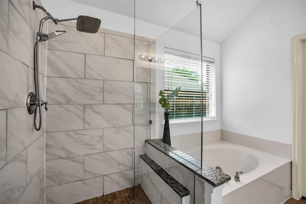 Welcome to SWEET PEACH — where charm, comfort, and location come together. Just steps from the park, this beautifully renovated 3-bedroom, 2-bath home in the Orchards of Allen offers a perfect blend of modern upgrades and functional living.Inside, the home has been thoughtfully updated from top to bottom, featuring new lighting, ceramic tile flooring, and water- and scratch-resistant luxury vinyl plank floors throughout the main areas. The kitchen shines with granite countertops, stainless steel appliances, and stylish finishes, while the living area is anchored by a stunning stone fireplace. Both bathrooms have been upgraded, including a sleek frameless glass shower. Fresh paint and new carpet complete the interior, giving the home a clean, move-in-ready feel.Designed with practicality in mind, the layout makes excellent use of every square foot, offering both comfort and flow for everyday living.Step outside and enjoy multiple inviting outdoor spaces. The front features a covered porch overlooking fresh landscaping—perfect for morning coffee. In the backyard, a large flagstone patio opens to a spacious grassy area, ideal for relaxing or entertaining.Additional upgrade: The garage is equipped with an electric vehicle (EV) charger, adding convenience for modern living.This is a rare opportunity to enjoy a fully updated home in a prime location—SWEET PEACH truly lives up to its name.