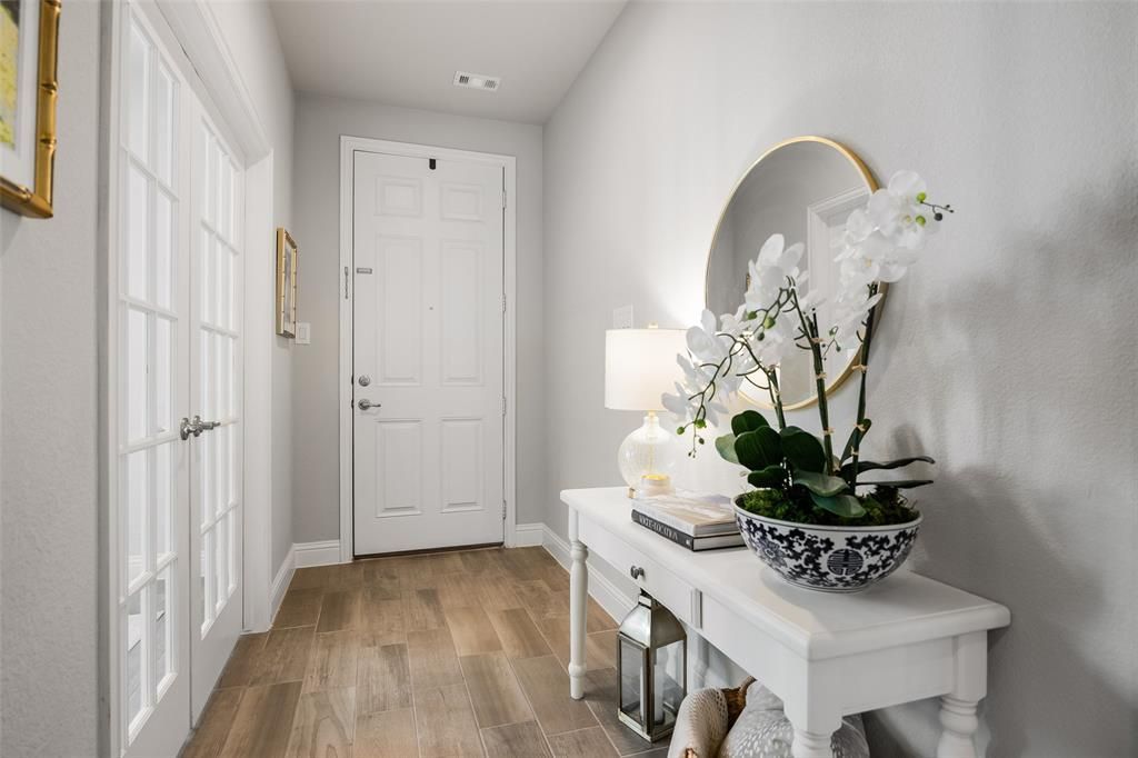 Welcome to this immaculate 3bedroom, 2 bath home with a study, located in the vibrant Trinity Falls community. This beautifully designed home boasts designer finishes throughout and offers an unparalleled lifestyle with access to hike and bike trails, 2 community pools, a dog park, splash pad, several parks, and a wide range of community activities. Perfect for those who enjoy an active lifestyle and a strong sense of community! As you step inside, you’re greeted by gorgeous wood-look tile that flows seamlessly through all the living and wet areas, complemented by upgraded carpet in the bedrooms for ultimate comfort. Designer light fixtures and plantation shutters throughout elevate the home’s sophisticated charm, while the extended 2.5 car garage with upgraded overhead storage offers plenty of space for all your storage needs. The heart of this home is the open concept kitchen, ideal for preparing meals and entertaining with family and friends. The kitchen flows into the spacious living area, where you'll find designer built-in cabinets, a striking stone fireplace, and a stunning cedar mantel. A wall of windows fills the room with natural light, creating a warm and inviting space. The home features a thoughtfully designed split bedroom layout, ensuring privacy. The large primary suite is truly an owner’s retreat, complete with an ensuite bath that rivals a spa with its luxurious finishes. The secondary bedrooms share a well appointed bath that’s conveniently located between them, perfect for family or guests. Step outside to your backyard oasis, a covered patio and expansive lot with plenty of room for outdoor activities. The backyard offers privacy and tranquility, and the home is situated on a quiet cul-de-sac lot, providing a peaceful environment for your family to enjoy. This one is sure to please even your pickiest buyers.