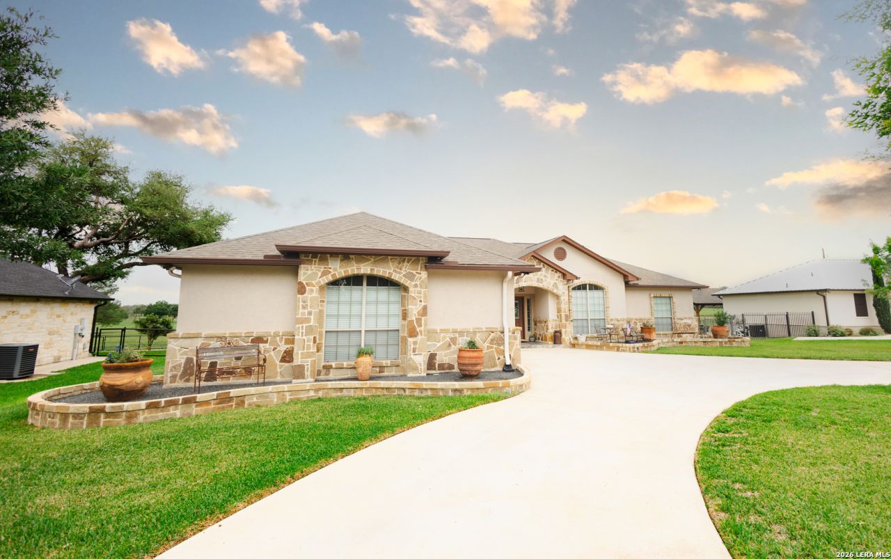 Spacious and thoughtfully designed - this custom built 4 bedroom home offers exceptional comfort and style in every detail. The open-concept living, dining and kitchen area creates a seamless flow, perfect for both everyday living and entertaining. The living room features a stunning rock fireplace and elegant coffered ceilings, adding warmth and character to the space. The large kitchen is a true centerpiece, complete with a bar serving area with barstools, a central island, and a large walk-in pantry - ideal for gatherings and functionality alike. The private primary suite is a relaxing retreat, showcasing coffered ceilings, and a luxurious en-suite bathroom with double vanities, a jacuzzi tub, spacious walk-in shower and an oversized walk-in closet! Three additional generously sized bedrooms are located on the opposite side of the home, offering privacy and flexibility for family or guests. Step outside to a large covered patio featuring a hot tub and breathtaking views of the Devine Golf Course - perfect for unwinding or entertaining. The over-sized attached 2 car garage is equipped with new epoxy flooring and a 2 ton mini-split A/C system for added comfort and versatility. Beautiful front yard landscaping enhances the homes curb appeal, making a lasting first impression. Front and back yard have sprinkler systems and also a water drip system for all landscaping. This one is a truly must see!