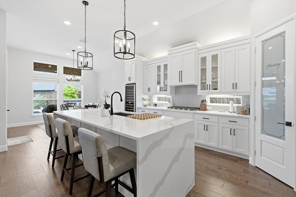 Welcome to a home that's designed not just to be lived in, but truly enjoyed. Nestled in the highly sought-after Canyon Falls community, this stunning one-story residence sits on an oversized lot and offers the perfect blend of comfort, style, and effortless entertaining. From the moment you step inside, you’re greeted with a sense of openness that immediately feels like home. With 2,764 square feet, a flexible floor plan, and a 3-car garage, there’s room here for everyone to spread out while still staying connected. The heart of the home is the sun-drenched family room, where walls of windows frame views of your sparkling pool, setting the stage for endless summer memories. This inviting space flows seamlessly into the eat-in kitchen and dining area, creating the perfect backdrop for everything from casual mornings to lively gatherings. Designed with beauty and function in mind, the kitchen is a dream for any home chef. Featuring a dramatic waterfall island, SS gas appliances, and a spacious wine or beverage fridge, it’s ready for everything from weeknight dinners to hosting friends and family. The owner’s retreat offers a true escape, inviting you to relax and recharge, complete with a spa-like ensuite featuring a luxurious walk-in shower, dual sinks, and generous storage. The oversized walk-in closet is just the cherry on top. The thoughtful layout continues with a versatile bonus room~media room plus a dedicated office—perfect for working from home, hobbies, or accommodating guests with ease. Your backyard oasis is built for Texas living, featuring a covered patio, outdoor kitchen, and a beautiful pool that turns every day into a staycation. Living in Canyon Falls means more than just owning a beautiful home, it’s a lifestyle. Enjoy access to resort-style amenities including the community pool, clubhouse, fitness center, miles of scenic trails and parks. This is the kind of home where memories are made, laughter is shared, and life feels just a little bit easier
