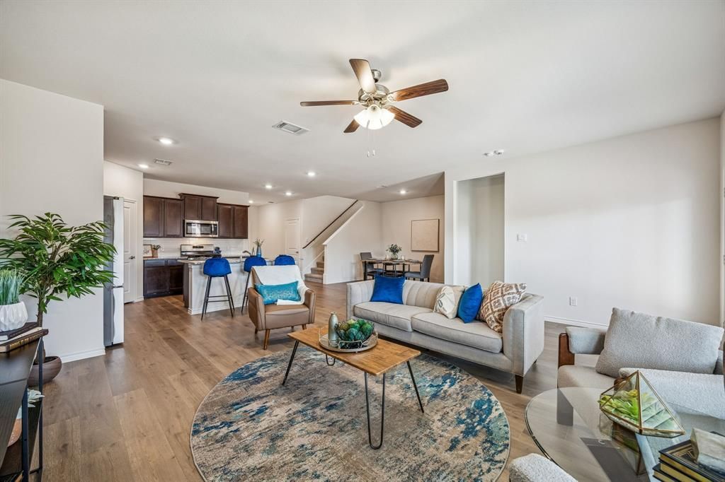Tucked quietly at the end of a cul-de-sac, this like-new 4-3 offers something increasingly rare in the neighborhood: space and privacy. This lot's location and access to neighborhood amenities are something the neighborhood's nearby new builds cannot replicate. Step outside and the cul-de-sac opens directly to a green belt and jogging path, inviting morning runs or evening walks. Turn the other direction, and just six homes down, the neighborhood pool and park await spontaneous trips. The location quietly elevates daily life. Inside, the home unfolds with an open layout designed for both flow and function. Luxury vinyl plank flooring runs through the main living areas, offering both style and durability for everyday living. The kitchen is highlighted by granite countertops, an island with breakfast bar seating, and subway tile backsplash. Whether it is casual breakfasts, shared meals, or evenings spent gathered around the island, this kitchen is built for connection. The dining nook offers a comfortable place for daily meals and plenty of room for company. The primary suite features a large walk-in shower with built-in seating, dual vanities, and thoughtfully designed shelving that keeps everything within reach. A massive walk-in closet completes the space, offering an abundance of storage. Upstairs, a spacious secondary living area provides endless options. Game room, media lounge, creative space, work-from-home retreat, or whatever suits your lifestyle. Throughout the home, smart technology adds a layer of modern convenience. A wall-mounted control panel and smartphone integration allow you to manage the home with ease, while window and door sensors provide peace of mind whether you are home or away. In a neighborhood filled with new construction, this home stands apart not by trying to be louder, but by being smarter. A prime lot. A cul-de-sac setting. Immediate access to trails, green space, and community amenities, and priced to make it hard to say no!